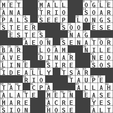 ACROSS 1. Was introduced to 4. Promenade 8. Stare 12. Santa ___, CA 13. Musical group of three 14. Fly high 15. Friends 17. Ooze 18. Yearns 19. Guide 21. "Barney Miller" actor Jack 23. Compass dir. 24. _____ Park, CO 26. Tired old horse 28. Period of immesurable duration 30. Legislator 34. Oblong piece of solid material 37. Rich soil 39. "Death on the ____" 40. "___ Maria" 41. Middle Eastern gold or silver currency 43. Modern: prefix 44. Actor's bit 46. The founder of a family 47. Distress signal 48. Under perfect conditions 51. Russian ruler of old 54. _ de Janeiro 55. Grayish beige 58. Make lace 61. Tax preparer (abbr.) 63. Assad's deity 65. Having winglike extensions 67. Count _ (2 wds.) 71. Comfort 72. Female horse 73. 43,560 square feet 74. Affirmative reply 75. The Jewish people; Israel 76. Stockings 77. The first octave above the treble staff DOWN 1. Atlas contents 2. Related on the mother's side 3. Stories 4. Mountains (abbr.) 5. "We ___ not amused" (Victoria) 6. Whopper 7. Chops off 8. Bear (Spanish) 9. Went 10. Falls behind 11. Celtic language 16. Stalk of a moss capsule 18. Grant temporary use of 20. To sift 22. Single 25. Exchanged or delivered for money 27. Separate the seeds from cotton 29. Annoyingly loud 30. Don Adams' spy role 31. Airtight sealed metal containers 32. Butter sub 33. Vintage cars 34. Indonesian resort city 35. Enthusiastic 36. French philosopher Descartes 38. Black tropical American cuckoo 42. Repose 45. Hearing organ 49. Louse (plural) 50. Trim (branches) 52. Auto club (abbr.) 53. General guideline 56. Beach, in Buenos Aires 57. Artist's stand 58. Scottish caps 59. Mountain range southwest of Kyrgyzstan 60. Edible starchy tuberous root 62. Wet nurse 64. Command 66. "___ Little Indians" 68. Environmental prefix 69. Big collection agency 70. Born