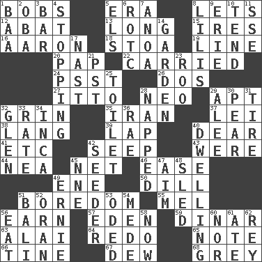 ACROSS 1. Moves up and down 5. Period 8. Allows 12. Blind as ____ 13. Having great length 15. Angers 16. Composer Copland 18. Portico 19. Actor's bit 20. Infant food 22. Borne 24. Inconspicuous attention getter 26. Two (Sp.) 27. "Tell ____ the Marines!" 28. Modern: prefix 29. Fitting 32. Broad smile 35. SW Asia republic 37. Flowery wreath 38. Long (Scottish) 39. Infant locale 40. Letter starter 41. And so on (abbr.) 42. Ooze 43. We are 44. Teachers' org. 45. Fish or hair follower 46. Relaxation 49. Compass dir. 50. Deli pickle 51. Mood resulting from idleness 55. Cartoonist voice _ Blanc 56. Merit 57. Locale of original sin 59. Middle Eastern gold or silver currency 63. Jai _ 64. Redecorate 65. Musical sound 66. Prong on a fork 67. Morning condensation 68. Jennifer or Joel DOWN 1. Sound made by sheep 2. Chief or king in Benin or Nigeria 3. Oblong piece of solid material 4. Constricting 5. Raised railways 6. College mil. group 7. Small Philippine buffalo 8. Ms. Damita and namesakes 9. 4th largest of the Great Lakes 10. Look after 11. Compass dir. 14. Place where plants grow 17. Political cartoonist Thomas 21. Pacific Standard Time (abbr.) 23. Friend of Pooh 25. Bathroom 28. Slept 29. Toward shelter 30. Lightbulb-shaped fruit 31. Become fatigued 32. Small, secluded valley 33. Pace 34. South American Indian 36. Actress Charlotte 40. Residence 42. Sowing specialist 45. Compass dir. 47. Direct toward a target or goal 48. Downhill vehicle 49. Bert's buddy 51. Indonesian resort city 52. Northwest Algerian city 53. Wrote a lyric poem 54. Ancient Persian 56. Consume 58. Immediately 60. And not 61. Had dinner 62. Marina Del _, California