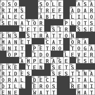ACROSS 1. Bear (Spanish) 4. Flatfish 8. White ___ sheet 11. Basketball hoops 13. Unclean, religiously 14. The sixth month of the Jewish calendar 15. Actor Baldwin 16. "This won't hurt ____!" 17. _ and Stitch 18. Legislator 21. Secret plans 22. Wig 23. Title for a knight 25. Compass dir. 26. Followers of ems 29. Ski resort town in Vermont 32. French painter Edouard 34. Feline 35. Mouth or opening 38. A single undivided whole 39. Stone: prefix 41. Ancient Roman robe 43. Choose 44. Wedding promise 45. Crowbar 46. Electrical Measurement 50. Compass dir. 51. Supplement with great effort 54. Nine, plus one 55. Puts into a specified state 57. Amusement-park features 59. French poetic form 63. Of the mouth 64. Tenth: prefix 67. Slanted text style (abbr.) 68. Deli pickle 69. Greek god of love 70. Painter Guido (1575-1642) 71. Compass dir. 72. Electrical Unit 73. Floor covering DOWN 1. Mouths or openings 2. Filth; sediment 3. Sign of things to come 4. A viewer who gazes fixedly 5. Globe 6. Luau accessory 7. Newt 8. Goodbye (Sp.) 9. Table seasonings 10. Came up 12. Go away! 14. 100% 19. Trial 20. Baseball player Mel 21. Adept person 23. Play the lead 24. "Tell ____ the Marines!" 26. Australian flightless bird 27. Billionth: prefix 28. Clip 30. Thespian 31. Observe 33. Singer James 36. Be footloose 37. Eras 39. Corncob 40. Paradise 42. "We ___ not amused" (Victoria) 45. Allows 47. Mountains (abbr.) 48. Aid 49. Turn to the right 51. Wear away 52. Japanese brewing company 53. Peak District village in England 56. Use a swizzle stick 58. Pipe bend 60. A distinct part 61. Nanny 62. Set down 64. Morning condensation 65. Period 66. Small bed