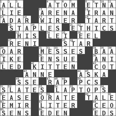 ACROSS 1. 100% 4. Tiny particle 8. Inactive volcano in Sicily 12. Falsehood 13. Sports stadium 14. SW Asia republic 15. The sixth month of the Jewish calendar 17. One who wires 18. Small pie 19. Paper fasteners 21. Value system 23. Part of HMS, perhaps 24. Flowery wreath 26. Snakelike fish 27. Painter Guido (1575-1642) 28. Play the lead 30. Rowing implement 31. Makes clutter 34. Sound made by sheep 37. D.D.E's nickname 38. Take place subsequently 39. Black tropical American cuckoo 40. Directed 41. Baby cat 42. Small bed 43. Queen of England 1702-14 44. "____ silly question..." 46. Compass dir. 47. Hit sharply and swiftly 50. Personal Computers (abbr.) 51. Chalkboards 54. Portable computers 57. Relaxation 58. Speak pompously 60. Lie 62. Arab leader 63. 61 cubic inches 64. Corporate head (abbr.) 65. Elected reps. 66. Genesis locale 67. Begley and Asner DOWN 1. According to 2. Hats (slang) 3. Tough but pliablecoriaceous 4. Satellite of Uranus 5. Laconic 6. Single 7. Female horse 8. One or the other 9. Go after with the intent to catch 10. Drug cop 11. Pismires 13. Leather borer 16. Precipitation 20. 23rd letter of the Greek alphabet 22. Beverages made from leaves 25. Come out of 27. Immoral or dissolute person 29. Adolescent 30. Lubricate 31. Count _ (2 wds.) 32. Keyboard key 33. Fast jet (abbr.) 34. Keyboard key 35. Small Philippine buffalo 36. Small island 41. Leg joint 43. Michaelmas daisies 44. Fitting 45. Highlander 46. Indian antelope 48. Having winglike extensions 49. Eucharist need 51. Perceives with the eye 52. Unable to walk 53. Flatfish 55. For each 56. Downhill vehicle 59. To free from 61. Greek goddess of the dawn