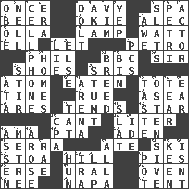 ACROSS 1. Single time 5. American folk hero Crockett 9. Health resort 12. Fermented drink made from hops 13. Migrant worker of the '30s 14. Actor Baldwin 15. Water jar 16. Desk light 17. Electrical Unit 18. Pipe bend 19. Allow 21. Stone: prefix 22. Silvers or Donahue 24. English channel? 26. Title for a knight 27. Imelda's hoard 28. Indian titles of respect 29. Tiny particle 30. Ingested 32. Haul 36. Prong on a fork 37. Regret 38. Toward the sea 39. Ancient Greek god of war 40. Is inclined (to) 42. Play the lead 43. Patter 44. 61 cubic inches 46. Nursemaid (var.) 49. Parent Teacher Association (abbr.) 50. Arabian gulf 51. Father Junipero _ 53. Had dinner 54. What Jean-Claude Killy likes to do 57. Portico 58. Land elevation 61. Sliced desserts 62. Celtic language 63. Mountain range 64. Baking chamber 65. Born 66. California wine valley 67. Portable shelter DOWN 1. Mitch Miller's instrument 2. 1994 drama film starring Jodie Foster 3. Portable communications device 4. Epoch 5. Dunce 6. Alias (abbr.) 7. Zeal 8. Slangy assent 9. Narrow boards 10. _ dish (used to culture cells) 11. Thespian 14. Deep reverence 19. Falsehood 20. Otherwise 21. Personal Computers (abbr.) 23. Residences 24. A special lineage 25. Storage container 27. Agitate 28. Check the growth or development of 29. _ moment's notice (2 wds.) 31. Sports stadium 32. Clothes sense 33. Clearly or manifestly demonstrative 34. Rend 35. Ewer handle 40. Make lace 41. Narrow board 43. Accounting whiz (abbr.) 45. Binary compound 46. NE Netherlands city 47. Distance measurement (Brit.) 48. Came up 52. Actress Charlotte 53. Silent film actress Nazimova 55. Peachy ____! 56. Is not 58. Attila the _ 59. Retirement account (abbr.) 60. Pet locale 61. Cooking vessel