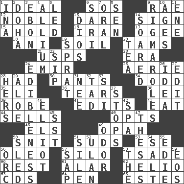 ACROSS 1. Standard of perfection 6. Distress signal 9. Actress Charlotte 12. Impressive in appearance 13. Have the gumption 14. Attach a signature 15. Hold, grip (Informal) 16. SW Asia republic 17. Double curve, resembling the letter S 18. Cuckoo 19. The visible part of the earth's surface 20. Scottish caps 21. United States Postal Service (abbr.) 23. Period 24. Arab leader 25. Nest on high 28. Possessed 30. Leg coverings 34. Texas town _ City 35. Connecticut Ivy Leaguer 36. Pulls into pieces 38. Flowery wreath 39. Loose flowing garment 41. Prepares for publication 43. Erode 44. Makes a sale 46. Elects 48. Raised railways 49. Brightly colored fish 50. In a ____ (agitated or irritated) 51. Beer foam 53. Compass dir. 56. Butter sub 57. Grain storage tower 58. Sadhe (variant) 60. Take ten 61. Having or resembling wings 62. Sun: prefix 63. Music discs 64. Animal enclosure 65. _____ Park, CO DOWN 1. _ tizzy (2 wds.) 2. Capital of the state of Qatar 3. Inky black, to poets 4. Plant genus of onion and garlic 5. Directed 6. Indian skirt 7. Of the mouth 8. Elected rep. 9. Complicated, petty procedures 10. Eons 11. Compass dir. 13. "Vaya con ____" 14. Flew 19. Small fatty European fish 20. Afternoon social gathering 22. Small drink 24. The property of being fit to eat 26. It may be bright or harebrained 27. Prepare for publication 28. Possessive pronoun 29. Medicinal plant 31. Born 32. Small boy 33. _ Lanka 37. Discontinues 40. American author Paul (1891-1958) 42. Health resort 45. Fast jet (abbr.) 47. College papers 49. Scent 50. Downhill vehicle 51. Filth; sediment 52. Uhlan (variant) 54. Table seasoning 55. Singer Brickell 56. The grampus (Milton) 57. Plant excrement 58. Definite Article 59. Greek goddess of the dawn