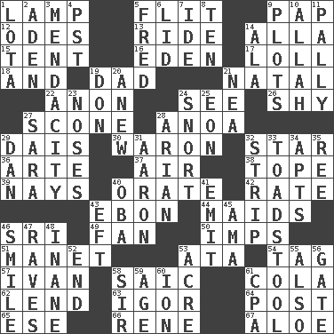 ACROSS 1. Desk light 5. Secret move to avoid paying debts 9. Infant food 12. Lyric poems 13. Travel on or in a vehicle 14. Silent film actress Nazimova 15. Portable shelter 16. Genesis locale 17. Hang loosely or laxly 18. Added to 19. June honoree 21. Relating to or accompanying birth 22. At once, immediately (arch.) 24. Observe 26. Like a shrinking violet 27. Biscuitlike quick bread 28. Small Philippine buffalo 29. Raised platform 30. Make _____ (do battle with) 32. Play the lead 36. Johnson of "Laugh-In" 37. Wind 38. Drink excessively 39. Negative votes 40. Declaim 42. Pace 43. Inky black, to poets 44. Women servants 46. _ Lanka 49. Avid follower 50. Naughty children 51. French painter Edouard 53. "One Day ___ Time" 54. Label 57. _ the terrible 58. Ketch in the Levant 61. Root beer relative 62. Grant temporary use of 63. Russian composer Stravinsky 64. Mail 65. Compass dir. 66. French philosopher Descartes 67. _ vera DOWN 1. Globular water bottle used in Asia 2. An important port of Yemen 3. Ananias' fault 4. Pacific Standard Time (abbr.) 5. Flintstone 6. Hat (slang) 7. Binary compound 8. "___ Little Indians" 9. Secret plans 10. Assad's deity 11. Chummy 14. Chicken ___ king 19. Spanish title 20. Afresh 21. Teachers' org. 23. Olfactory organs 24. Derisive sound 25. Period of immesurable duration 27. "Two Mules for Sister ____" 28. Believer in; advocate of (suffix) 29. One of the 12 tribes of Israel 31. Composer Copland 32. Long narrow piece of something 33. Inedible or poisonous agaric 34. Tenement units (abbr.) 35. To sift 40. Chief or king in Benin or Nigeria 41. Send forth 43. Bank Draft (abbr.) 45. Nanny (var.) 46. Grin 47. All-night dance parties 48. Empty; void 52. Conclusion 53. 43,560 square feet 55. In addition 56. Yard entry 58. Title for a knight 59. Personal question 60. Electrically charged atom 61. Tax preparer (abbr.)