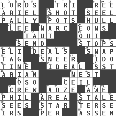 ACROSS 1. Titled peers of a realm 6. Three (prefix) 9. To sift 12. Satellite of Uranus 13. Guess 14. Sew up the eyelids of hawks and falcons 15. Chummy 16. Plant holders 17. Frame or body of a ship 18. Area sheltered from the wind 19. Drug cop 20. Immeasurably long periods of time 21. Drawn tight 23. Fr. "Yes" 24. Post 25. Discontinues 28. Biblical high priest 30. Allots cards 34. Fastener 35. Label 36. Scornful expression 38. Wedding promise 39. Prong on a fork 41. Standard of perfection 43. Fast jet (abbr.) 44. Believer in; advocate of (suffix) 46. A home for chicks 48. Bear (Spanish) 49. To provide with a ceiling 50. Group working together 51. Axlike tool, used for shaping wood 53. Deep reverence 56. Silvers or Donahue 57. Length times width 58. Having lost freshness 60. Perceives with the eye 61. Play the lead 62. Laconic 63. Big collection agency 64. For each 65. NE Netherlands city DOWN 1. Pet locale 2. Of the mouth 3. Cause heat under the collar 4. Erase 5. Secret 6. Son of Odin 7. College mil. group 8. ___ a Wonderful Life 9. One who advocates reunion 10. Snakelike fish 11. Pipe bend 13. Petty quarrel 14. Yells 19. Unadorned figures 20. Greek goddess of the dawn 22. Plus 24. Seigniories (variant) 26. Writing tablets 27. Specific locale 28. Singer James 29. Den 31. Cuckoo 32. Directed 33. Observe 37. The wife of a rajah (variant) 40. Artist's stands 42. Luau accessory 45. Immediately 47. Chalkboards 49. Russian ruler of old 50. "Mermaids" star 51. Johnson of "Laugh-In" 52. Letter starter 54. Armed conflicts 55. Otherwise 56. 23rd letter of the Greek alphabet 57. Cleo's killer 58. R.R. building 59. Car or cant ending