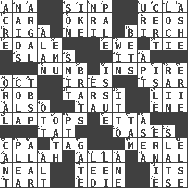 ACROSS 1. Nursemaid (var.) 4. Simple or foolish person 8. Southern CA. univ. 12. 4-wheeled motor vehicle 13. Gumbo ingredient 14. Vintage cars 15. Capital of Latvia 17. Famous astronaut Armstrong 18. A tree used for making furniture 19. Peak District village in England 21. She-sheep 23. Standoff 24. Shuts with force 26. Call ___ day 28. Unfeeling 30. Heighten or intensify 34. Sep. follower 37. Angers 39. Russian ruler of old 40. Director Reiner 41. Tarsus (plural) 43. Cards in a Roman deck? 44. In addition 46. Pulled tight 47. Compass dir. 48. Portable computers 51. Singer James 54. Make lace 55. Fertile tracts in a desert 58. Tax preparer (abbr.) 61. Label 63. Haggard of country music 65. Assad's deity 67. Silent film actress Nazimova 71. Of or related to the anus 72. Actress Patricia 73. Adolescent 74. It is 75. Small pie 76. Singer Brickell 77. Compass dir. DOWN 1. Land measure 2. Women servants 3. Therefore, facetiously 4. Male offspring 5. Eisenhower's nickname 6. Medical imaging device (abbr.) 7. Light colored 8. RI univ. 9. Foregone conclusion 10. Locales 11. American tennis player Robert 16. ____ Jay Lerner 18. Wagers 20. Australian flightless bird 22. Acquire through effort 25. Stricken, poetically 27. Fitting 29. Naughty children 30. Come out of 31. Small island 32. Water falling in drops from the sky 33. One of the Great Lakes 34. Spoken 35. Root beer relative 36. Cook's measure (abbr.) 38. Period 42. "Tell ____ the Marines!" 45. Baseball player Mel 49. Pledge 50. Parent Teacher Assoc. 52. Scottish cap 53. Toward the sea 56. Bert's buddy 57. Narrow boards 58. Patter 59. Entreaty 60. Having or resembling wings 62. Yard entry 64. Otherwise 66. The first octave above the treble staff 68. Directed 69. Flowery wreath 70. A saturated hydrocarbon