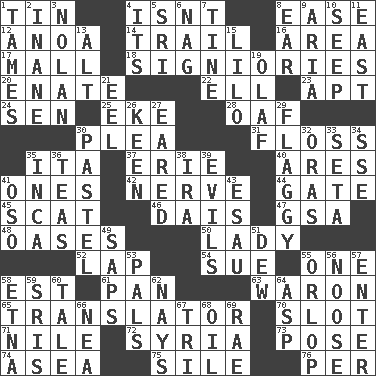 ACROSS 1. Metal container 4. Is not 8. Relaxation 12. Small Philippine buffalo 14. Lag or linger behind 16. Type of rug 17. Promenade 18. Seigniories (variant) 20. Related on the mother's side 22. Pipe bend 23. Fitting 24. Elected rep. 25. Supplement with great effort 28. Clumsy lout 30. Entreaty 31. Soft thread for cleaning between teeth 35. Call ___ day 37. One of the Great Lakes 40. Ancient Greek god of war 41. Washington bills 42. Boldness 44. Yard entry 45. Go away! 46. Raised platform 47. Girls' org. (abbr.) 48. Fertile tracts in a desert 50. Kenny Rogers chart-topper in '80 52. Pet locale 54. Take to court 55. Single 58. Eastern Standard Time (abbr.) 61. Baking dish 63. Make _____ (do battle with) 65. Interpreter 70. Groove 71. The longest river in the world 72. Damascus' land 73. Airs 74. At sea 75. Drop; flow; fall 76. For each DOWN 1. Softens 2. Empty; void 3. Pitcher Ryan 4. It is 5. Indian title of respect (Mr.) 6. Tired old horse 7. Prong on a fork 8. Ewer handle 9. Operatic vocal solo 10. Ooze 11. Compass direction 13. Keyboard modifier key 15. _ and Stitch 19. Norwegian king 21. Snakelike fish 26. Peachy ____! 27. Having ears or earlike features 29. Insipid 30. Soft color 32. Mouths or openings 33. Stalk of a moss capsule 34. Compass dir. 35. South American Indian 36. Afternoon social gatherings 38. Lyricist Gershwin 39. Vices 41. Bear (Spanish) 43. Son of Isaac 49. Plant excrements 51. Morning condensation 53. Friends 55. Fourth or lowest deck 56. Trap for birds or small mammals 57. Keyboard key 58. Inactive volcano in Sicily 59. Indian titles of respect 60. Story 62. Negative votes 64. Viper 66. Teachers' org. 67. Three (prefix) 68. Petroleum 69. Actress Charlotte