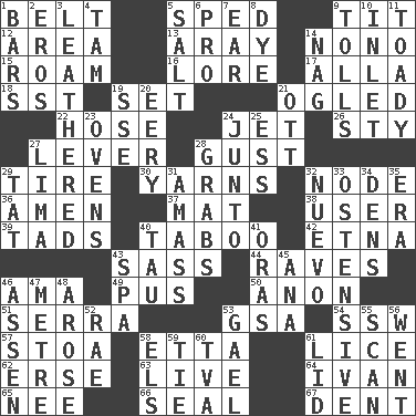 ACROSS 1. Waist strap 5. Broke a traffic law 9. Teat (slang) 12. Type of rug 13. Like ___ of sunshine 14. Words to Nanette 15. Wander 16. Old wives' tales, e.g. 17. Silent film actress Nazimova 18. Fast jet (abbr.) 19. Arrange properly for use 21. Stared 22. Stockings 24. Type of plane 26. Filthy place 27. Crowbar 28. Abrupt rush of wind 29. Become fatigued 30. Tall tales 32. Connecting point 36. So be it 37. Floor covering 38. One who uses or employs something 39. Small boys 40. Off limits 42. Inactive volcano in Sicily 43. Backtalk 44. All-night dance parties 46. Housemaid (var.) 49. Product of festering 50. Soon (poet.) 51. Father Junipero _ 53. Girls' org. (abbr.) 54. Compass dir. 57. Portico 58. Singer James 61. Louse (plural) 62. Celtic language 63. Moving, as bait 64. _ the terrible 65. Born 66. Lick closed 67. Undesirable depression on a surface DOWN 1. Long, evenly shaped pieces 2. Greek god of love 3. Resembling or made to resemble leather 4. Scottish cap 5. Table seasoning 6. Adept person 7. Ewer handle 8. Color 9. For Whom the Bell _____ 10. An arm off of a larger body of water 11. Sycophant 14. Tired old horse 19. Compass dir. 20. Suggestive of the supernatural 21. Baseball player Mel 23. Baking chambers 24. Secret group 25. Curvy letter 27. Pale green bean 28. Seizes 29. Make lace 31. Collect or gather 32. New (sp.) 33. Clearly or manifestly demonstrative 34. Habitations of wild animals 35. Period 40. The 19th letter of the Greek alphabet 41. Mouths or openings 43. Health resort 45. Santa ___, CA 46. NE Netherlands city 47. Distance measurement (Brit.) 48. Came up 52. Actress Charlotte 53. Highlander 55. Skim 56. Gone 58. Raised railways 59. Neckwear 60. Federal power corp. 61. Flaplike covering