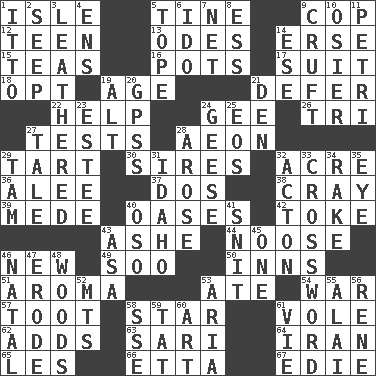 ACROSS 1. Small island 5. Prong on a fork 9. Police officer (slang) 12. Adolescent 13. Lyric poems 14. Celtic language 15. Afternoon social gatherings 16. Plant holders 17. Set of matching outer garments 18. Elect 19. Personal question 21. Put off 22. Assist 24. Turn to the right 26. Three (prefix) 27. Trials 28. A really long time 29. Small pie 30. Fathers 32. 1/640 square mile 36. Toward shelter 37. Two (Sp.) 38. Supercomputer manufacturer 39. Ancient Persian 40. Fertile tracts in a desert 42. Puff or smoke 43. American tennis player Robert 44. Trap for birds or small mammals 46. ___ Haven, CT 49. "Barney Miller" actor Jack 50. Lodging establishments 51. Odor 53. Had dinner 54. Armed conflict 57. A blast of a horn 58. Play the lead 61. Short-tailed, large-bodied rat 62. Does sums 63. Indian skirt 64. SW Asia republic 65. French article 66. Singer James 67. Singer Brickell DOWN 1. "Tell ____ the Marines!" 2. Ooze 3. Tough but pliablecoriaceous 4. Followers of ems 5. Drink excessively 6. Wedding promise 7. Remaining after all deductions 8. Double-curved letter 9. An unpleasant substance 10. Flexible twig of a willow tree 11. _ dish (used to culture cells) 14. Compass dir. 19. Keyboard modifier key 20. Global Positioning Systems (abbr.) 21. Lair 23. First name in cosmetics 24. Honkers 25. Greek goddess of the dawn 27. Story 28. Came up 29. Scottish cap 31. Potato state 32. 13-14th century defensive garment 33. What you're doing now 34. Libertine 35. Sight organ 40. Bear (Spanish) 41. In a ____ (agitated or irritated) 43. White ___ sheet 45. Single 46. Brizilian seaport 47. Wear away 48. Forest 52. Mountains (abbr.) 53. Roberta Peters solo 55. Mountain range southwest of Kyrgyzstan 56. French philosopher Descartes 58. Compass dir. 59. Make lace 60. Nonscientific branch of learning 61. Compete