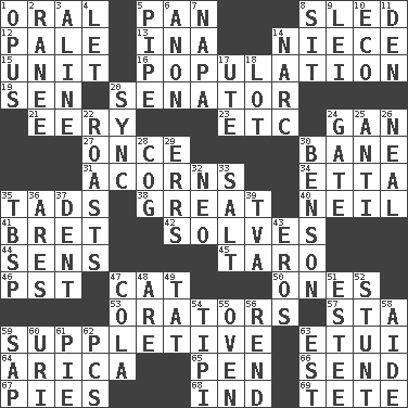 ACROSS 1. Of the mouth 5. Baking dish 8. Downhill vehicle 12. Diluted with white 13. _ tizzy (2 wds.) 14. Sibling's daughter 15. A single undivided whole 16. Census information 19. Elected rep. 20. Elected representative 21. Suggestive of the supernatural 23. And so on (abbr.) 24. Separate the seeds from cotton 27. Single time 30. Object of repulsion 31. Oak nuts 34. Singer James 35. Small amounts or degrees 38. Relatively large 40. Famous astronaut Armstrong 41. Cy Young winner Saberhagen 42. Finds the solution 44. Elected reps. 45. Pacific island yam 46. Pacific Standard Time (abbr.) 47. Feline 50. Singles 53. Speakers 57. R.R. building 59. Supplementary 63. Needle holder 64. N. Chile seaport 65. Fenced enclosure 66. Post 67. Sliced desserts 68. Indiana (abbr.) 69. False hair DOWN 1. Musical composition 2. The wife of a rajah (variant) 3. Place in a line 4. Allow 5. Corncob 6. Soon (poet.) 7. California wine valley 8. Be seated 9. Luau accessory 10. Environmental prefix 11. Lair 14. Drug cop 17. Shoshoni 18. Car dealer's back yard 20. Synchronize (abbr.) 22. Exposes to great heat 24. Yard entry 25. Opposed to 26. Actress Patricia 28. Gear tooth 29. Blunders 30. Gillaume's butler role 32. Modern: prefix 33. Table seasoning 35. Cook's measure (abbr.) 36. Ancient Greek god of war 37. Undesirable depression on a surface 39. Federal power corp. 43. Greek god of love 47. Root beer relative 48. "We ___ not amused" (Victoria) 49. Make lace 51. First name in cosmetics 52. Check the growth or development of 54. Native american tent (variation) 55. Baking chamber 56. Tear apart 58. Helper 59. Plant excrement 60. RI univ. 61. Sliced dessert 62. Personal Computers (abbr.) 63. Eastern Standard Time (abbr.)
