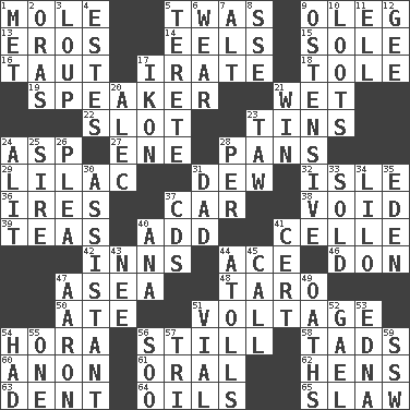 ACROSS 1. Undercover agent 5. It was, poetically 9. Cassini of fashion 13. Greek god of love 14. Snakelike fish 15. Flatfish 16. Strained 17. Feeling or showing extreme anger 18. Lacquered or enameled metalware 19. Orator 21. Soggy 22. Slit 23. Metal containers 24. Cleo's killer 27. Compass dir. 28. Zero-star reviews 29. Pale purple color 31. Morning condensation 32. Small island 36. Angers 37. Auto 38. Null 39. Afternoon social gatherings 40. Say or write further 41. Cell (Danish) 42. Lodging establishments 44. Adept person 46. Spanish title 47. Toward the sea 48. Edible starchy tuberous root 50. Had dinner 51. Electrical Measurement 54. Israeli folk dance 56. Free from disturbance or agitation 58. Bits 60. Soon (poet.) 61. Spoken 62. Coop moms 63. Gouge 64. Lubricates 65. Cole _ (cabbage dish) DOWN 1. Was introduced to 2. Mouths or openings 3. Central Nebraska county 4. _____ Park, CO 5. Cylindrical with tapered ends 6. Put on (as clothing) 7. Keyboard modifier key 8. Compass dir. 9. Clearly or manifestly demonstrative 10. Plunders 11. Pipe bend 12. Unit of force equal to gravity 17. Picture 20. Actor Baldwin 21. Acquire through effort 23. The 23rd letter of the Hebrew alphabet 24. Set down 25. Father 26. Entreaty 28. For each 30. Helper 31. Male parent 33. Exchanged or delivered for money 34. _ and Stitch 35. Locale of original sin 37. Music discs 40. Santa ___, CA 41. An absolute certainty 43. Born 44. Ringlike coral islands and reefs 45. Give a ring to 47. Composer Copland 49. Curses 51. Small bottle 52. Highlander 53. Pulitzer Prize-winning author Ferber 54. Possessed 55. Single 56. "Barney Miller" actor Jack 57. Three (prefix) 59. Compass dir.
