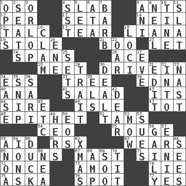 ACROSS 1. Bear (Spanish) 4. Thick slice 8. Pismires 12. For each 13. Bristle 14. Famous astronaut Armstrong 15. Baby powder 17. Rend 18. Climbing, woody, usually tropical vines 19. Fur scarf 21. Sometimes accompanies a hiss 23. Allow 24. Connects, as a bridge 26. Adept person 28. Confront 30. Popular '50s hangout 34. Double-curved letter 37. Family _ (genealogy) 39. Pulitzer Prize-winning author Ferber 40. Santa ___, CA 41. First course 43. ___ a Wonderful Life 44. Father 46. Small island 47. Small child 48. Curse 51. Scottish caps 54. Corporate head (abbr.) 55. Makeup applied to the cheeks 58. Help 61. Acura sports coupe 63. Puts on (as clothing) 65. Parts of speech 67. Vertical spar for supporting sails 71. Trig term 72. Single time 73. Mine, in Marseilles 74. Whopper 75. "____ silly question..." 76. Blemish 77. It is so DOWN 1. Chooses 2. Theater features 3. Lowest deck of a ship 4. Fast jet (abbr.) 5. Area sheltered from the wind 6. "One Day ___ Time" 7. Sharp remark 8. Cuckoo 9. Actress Patricia 10. Prong on a fork 11. Narrow board 16. Dollar (slang) 18. Venues 20. Compass dir. 22. Rowing implement 25. Arranges properly for use 27. First lady 29. Distinguishing feature 30. Started a card game 31. Prepare for publication 32. To the inside or interior of 33. Political cartoonist Thomas 34. Comfort 35. Clip 36. Indian skirt 38. Raised railways 42. Letter starter 45. And so on (abbr.) 49. Possessive pronoun 50. Greek goddess of the dawn 52. Cut the grass 53. Institutes legal proceedings 56. Lightheartedly 57. Bert's buddy 58. Small Philippine buffalo 59. Charged particles 60. Evade 62. Dec. holiday 64. Observes 66. Teachers' org. 68. Electrical Unit 69. "Barney Miller" actor Jack 70. Teat (slang)