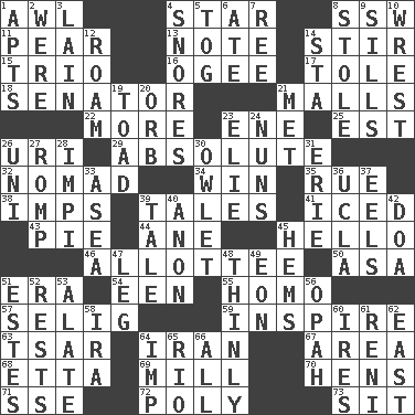 ACROSS 1. Leather borer 4. Play the lead 8. Compass dir. 11. Lightbulb-shaped fruit 13. Short letter 14. Use a spoon 15. Musical group of three 16. Double curve, resembling the letter S 17. Lacquered or enameled metalware 18. Legislator 21. Promenades 22. Greater amount 23. Compass dir. 25. Eastern Standard Time (abbr.) 26. RI univ. 29. Utter; complete 32. Roamer 34. Victory 35. Regret 38. Naughty children 39. Lies 41. On the rocks 43. Sliced dessert 44. A saturated hydrocarbon 45. Phone greeting 46. One to whom something is allotted 50. White ___ sheet 51. Epoch 54. Car or cant ending 55. Same (prefix) 57. Former Milwaukee Brewers owner Bud 59. Stimulate to action 63. Russian ruler of old 64. SW Asia republic 67. Length times width 68. Singer James 69. Place where flour is made 70. Coop moms 71. Compass dir. 72. Much (prefix) 73. Be seated DOWN 1. Tenement units (abbr.) 2. Past tense of be (plural) 3. (Had) reclined 4. Sounds asleep 5. Coat; cloak 6. Had dinner 7. Portuguese money of account (variant) 8. Took without asking 9. Beverly of Met fame 10. Obtain by seizing forcibly or violently 12. Wander aimlessly 14. R.R. building 19. Frog relative 20. Globe 21. Was introduced to 23. Writer Wiesel 24. Religious women 26. University (slang) 27. Frolic 28. Body of Kaffir warriors 30. A small or young owl 31. One of the Great Lakes 33. Toward the sea 36. Southern CA. univ. 37. Snakelike fish 39. Story 40. Soon (poet.) 42. ___ good deed 45. Equivocates 47. Part of a journey 48. Without viscosity 49. A really long time 51. _____ Park, CO 52. Musical pauses 53. Having winglike extensions 56. Brightly colored fish 58. Lyricist Gershwin 60. Angers 61. Painter Guido (1575-1642) 62. Compass direction 64. Mischievous child 65. _ de Janeiro 66. Everything