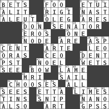 ACROSS 1. Antes 5. Egg _ yung 8. Needle holder 12. Set down 13. Swiss mountan, "Queen of the Mountains" 15. Political cartoonist Thomas 16. Native American of Southwest Alaska 18. Cassini of fashion 19. Ancient Greek god of war 20. Spanish title 22. Legislator 24. Greek god of love 26. Single 27. Thickened enlargement 28. "We ___ not amused" (Victoria) 29. Cleo's killer 32. Penny 35. Johnson of "Laugh-In" 37. Lion 38. Mouths or openings 39. Corporate head (abbr.) 40. Gouge 41. Pacific Standard Time (abbr.) 42. Christmas carol 43. Soaks 44. Perceive with the eye 45. Ribbon knot 46. Unable to walk 49. Medical imaging device (abbr.) 50. Travel by water 51. Elects 55. 100% 56. Observes 57. Singer James 59. Citrus fruits 63. Canisters 64. Clip 65. Billionth: prefix 66. In addition 67. Nonscientific branch of learning 68. Global Positioning Systems (abbr.) DOWN 1. Sound made by sheep 2. Pipe bend 3. Standoff 4. SAT takers 5. Back 6. Lubricates 7. Double curve, resembling the letter S 8. Maternal 9. Pacific island yam 10. One who uses or employs something 11. ___ a Wonderful Life 14. Disregard 17. "Corrida" creature 21. Allow head to fall sleepily 23. One (Scot) 25. Manatee 28. Ringlike coral islands and reefs 29. Toward shelter 30. Transmitted 31. Cooking vessels 32. 911 reaches them 33. Celtic language 34. Nathan's nickname 36. To separate or throw off 40. Residence 42. Annoying sounds 45. Sis' sibling 47. Auto club (abbr.) 48. Place where flour is made 49. With motion or animation 51. To provide with a ceiling 52. Coop moms 53. Inactive volcano in Sicily 54. Use a spoon 56. R.R. building 58. Fitting 60. Atlas unit 61. Followers of ems 62. Distress signal