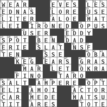 ACROSS 1. Erode 5. Nights before holidays 9. French article 12. Ferber et al. 14. Old wives' tales, e.g. 15. Purpose 16. 61 cubic inches 17. Medicinal plant 18. Floor covering 19. Luau accessory 20. Pressed 23. Musical composition 24. One who makes use of a thing 25. Whirlpool 27. Blemish 30. Benjamin's nick name 32. Male parent 33. 4th largest of the Great Lakes 34. Narrow board 36. Science/research agcy. 38. Nine, plus one 39. Compass dir. 40. Chief or king in Benin or Nigeria 43. Barrel 46. Hearing organs 48. Pate de foie ____ 49. Spoil 51. Allow 52. Gumbo ingredient 53. Fine (Spanish) 54. Pacific island yam 56. Table seasoning 58. Electrical Unit 61. Choose 64. Biblical high priest 65. Mine, in Marseilles 66. Thespian 68. 4-wheeled motor vehicle 69. Ancient Persian 70. Taiwanese island in East China Sea 71. Teat (slang) 72. Ancient Greek god of war 73. Carryall DOWN 1. Water source 2. Singer Brickell 3. Opposed to 4. Actress Charlotte 5. Liveliness 6. Short-tailed, large-bodied rat 7. Eaten away 8. Observe 9. Containing lumps 10. He sold his birthright 11. Puts into a specified state 13. Indian titles of respect 21. Confederate soldiers (slang) 22. Threatening words 23. Probability 24. Shoshoni 26. Daniel's nick name 27. Put into a specified state 28. Before (prefix) 29. Pig sound 31. Relating to the nose 35. Cigar-shaped 37. Tined utensil 41. Soap unit 42. White ___ sheet 44. Give off 45. Separate the seeds from cotton 47. Play the lead 48. Thick or sticky substance 50. Nomad 53. Seductive woman who exploits men 55. 480, 500 or 516 sheets of paper 56. Religious group 57. Jai ____ 59. Method 60. Sliced desserts 61. "Beetle Bailey" pooch 62. Mail 63. Loyal 65. Nanny (var.) 67. Domesticated feline