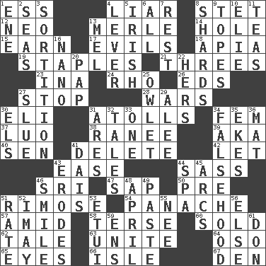 ACROSS 1. Curvy letter 4. One who doesn't tell the truth 8. Proofreading order 12. Modern: prefix 13. Haggard of country music 14. Hollow 15. Merit 17. Vices 18. Capital of Western Samoa 19. Paper fasteners 21. Triads 23. _ tizzy (2 wds.) 24. 17th letter of the Greek alphabet 26. Begley and Asner 27. Obstruct or block passage 28. Armed conflicts 30. Connecticut Ivy Leaguer 31. Ringlike coral islands and reefs 34. Opposite of masc. 37. Nilotic language 38. The wife of a rajah (variant) 39. Alias (abbr.) 40. Elected rep. 41. Keyboard key 42. Allow 43. Relaxation 44. Backtalk 46. Indian title of respect (Mr.) 47. Plant excrement 50. Before (prefix) 51. Full of chinks, cracks, or crevices 54. Flamboyance 57. Among 58. Laconic 60. Disposed of to a purchaser 62. Lie 63. Join together 64. Bear (Spanish) 65. Sight organs 66. Capri or Wight 67. Lair DOWN 1. Compass dir. 2. Oceans 3. Drawing lots 4. Crowbar 5. From or relating to Ireland 6. 100% 7. State of inaction 8. Broken pieces 9. Drinks excessively 10. Writer Wiesel 11. Afternoon social gatherings 13. Cartoonist voice _ Blanc 16. Billionth: prefix 20. Infant food 22. Possessive pronoun 25. A small or young owl 27. Change direction abruptly 29. Toward shelter 30. Raised railways 31. Ancient Greek god of war 32. Lies 33. Single 34. It jiggles the polygraph 35. Supplements with great effort 36. Floor covering 41. Raised platform 43. Eats (away) 44. Health resort 45. Curves 46. Grin 48. Showery time 49. Thick mixture 51. Assign a rank or rating to 52. "If ____ say so..." 53. Needle holder 55. Born 56. Otherwise 59. Followers of ems 61. Spanish title