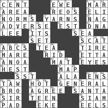 ACROSS 1. Penny 5. She-sheep 8. Make imperfect 11. Length times width 12. Vintage cars 14. Biblical high priest 15. Typical standards 17. Entertaining tales 18. Tired old horse 19. Contrary to your interests or welfare 21. Eastern Standard Time (abbr.) 22. Heredity factor (abbr.) 23. Area sheltered from the wind 24. ___ a Wonderful Life 25. Ocean 27. Arrange properly for use 28. Go away! 31. Lettered men learn these first 35. Beverage made from leaves 37. Hoop that covers a wheel 38. Female horse 39. To free from 41. Singer James 42. Small Philippine buffalo 43. Floor covering 45. Snake ____ (dice throw) 46. Command 47. Atlas unit 49. Fast jet (abbr.) 51. Insect wing 52. Followers of ems 55. The 23rd letter of the Hebrew alphabet 57. Being at a high temperature 60. Commissioned military rank 62. Sis' sibling 63. Match 65. Before Barbara or Clara 66. Title for a knight 67. Adolescent 68. Thailand, formerly 69. Writing tablet 70. Make supply last 71. Snakelike fish DOWN 1. Lessep's creation 2. Wear away 3. Impudent aggressiveness 4. Not wild 5. Period 6. We are 7. Immeasurably long periods of time 8. Ananias' fault 9. Actor Alda or Thicke 10. Port city in Latvia 13. Fast planes 16. Indian titles of respect 17. Last past 20. Proofreading order 26. First name in cosmetics 29. Johnson of "Laugh-In" 30. Afternoon social gatherings 31. Nursemaid 32. Object of repulsion 33. What you're doing now 34. Theater features 36. Direct toward a target or goal 40. Break 44. Story 48. Zero-star reviews 50. Not this but _ 52. Bert's buddy 53. Brizilian seaport 54. Shuts with force 55. Cook's measure (abbr.) 56. Operatic vocal solo 58. Double curve, resembling the letter S 59. Long journey 61. Relaxation 64. Compass dir.