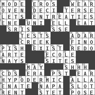 ACROSS 1. Method 5. Greek god of love 9. Erode 13. Baking chamber 14. Tenth: prefix 15. Laconic 16. Allows 17. Pleas 19. Compass dir. 20. Corn or form start 21. Pipe bend 22. Erode 23. Indian titles of respect 25. Compass dir. 26. Trials 30. The sixth month of the Jewish calendar 34. Small stream 35. Fine (Spanish) 36. Expression of disdain 39. Be 42. Make new 43. Johnson of "Laugh-In" 44. Learning spot: Fr. 46. Negative votes 47. Locates 48. Fifth month 51. Quiet! 54. Music discs 57. Period 58. Pacific Standard Time (abbr.) 60. Hearing organ 62. Below the epidermis 65. Silent film actress Nazimova 66. Related on the mother's side 67. California wine valley 68. Slit 69. Monthly bill 70. Proofreading order 71. Airs DOWN 1. Undercover agent 2. Baking chambers 3. Prevent from occurring 4. Followers of ems 5. Genesis locale 6. Painter Guido (1575-1642) 7. Sep. follower 8. Founders of families 9. Dripping 10. One of the Great Lakes 11. Toward the sea 12. Relief 15. Lie 18. Raised railways 20. One who uses or employs something 24. Skin irritations 27. Perceive with the eye 28. John Ritter's dad 29. Atmospheres 30. Anew 31. Expire 32. Added to 33. Friend of Pooh 36. Baking dish 37. Retirement account (abbr.) 38. Filthy place 40. _-fi 41. Small child 45. For fear that 48. Ancient Persian 49. "We ___ not amused" (Victoria) 50. Entertaining tales 52. Phone greeting 53. Auras 54. "Mermaids" star 55. Unit of force 56. Connect, as a bridge 58. Corncob 59. Scram, to a cat 61. Pace 63. Baseball player Mel 64. Floor covering 65. Viper