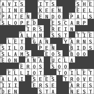 ACROSS 1. Advice 5. ___ a Wonderful Life 8. A female animal or person 11. Actor's bit 12. Peachy ____! 14. Snakelike fish 15. Eucharist need 17. Inside; within (prefix) 18. Friends 19. Inclined 21. Fortification 23. Big collection agency 25. It's straight from the horse's mouth 26. Actor Alda or Thicke 27. Fast jet (abbr.) 28. Make a knot 31. Allow 33. Separate the seeds from cotton 35. Entertaining tales 37. Grain storage tower 38. Animal enclosure 40. Auction offers 41. Shuts with force 43. Greek goddess of the dawn 45. Oct. 31 cry 46. A really long time 47. Santa ___, CA 50. Southern CA. univ. 52. Greek god of love 53. "Barney Miller" actor Jack 54. American author Paul (1891-1958) 56. Bathroom plumbing fixture 61. Mountain range southwest of Kyrgyzstan 62. Observes 65. Collection of objects 66. One more than two 67. Celtic language 68. Ancient Greek god of war 69. Lair 70. R.R. building 71. A home for chicks DOWN 1. High mountains 2. Small bottle 3. To the inside or interior of 4. Ooze 5. D.D.E's nickname 6. "___ Little Indians" 7. Spring feasts 8. Scorch 9. Aid 10. Raised railways 13. Olfactory organs 16. Famous astronaut Armstrong 18. Baking dish 20. To draw with force 22. Municipality 24. Fastener 26. Tiny particle 28. Musical group of three 29. _ china 30. Double-curved letter 31. _ and Stitch 32. Flair 34. Born 36. Swedish rock group 37. Compass dir. 39. Horse sense 42. Indian skirt 44. Native of Scotland 48. Trap for birds or small mammals 49. Michaelmas daisies 51. Plunder 52. Biblical high priest 54. Writer Wiesel 55. (Had) reclined 57. SW Asia republic 58. Old wives' tales, e.g. 59. Nights before holidays 60. Trial 61. Assist 63. Eastern Standard Time (abbr.) 64. Ocean