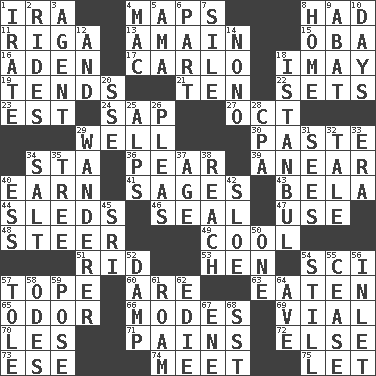 ACROSS 1. Lyricist Gershwin 4. Atlas contents 8. Possessed 11. Port city in Latvia 13. With great haste 15. Chief or king in Benin or Nigeria 16. An important port of Yemen 17. Monte _, Las Vegas Hotel/Casino 18. "If ____ say so..." 19. Watches over 21. Nine, plus one 22. Puts into a specified state 23. Eastern Standard Time (abbr.) 24. Plant excrement 27. Sep. follower 29. Not ill 30. Thick mixture 34. R.R. building 36. Lightbulb-shaped fruit 39. Approach 40. Merit 41. Gurus 43. Actor Lugosi 44. Bobsleighs 46. Lick closed 47. Purpose 48. Navigate 49. Calm and collected 51. To free from 53. Layer 54. _-fi 57. Drink excessively 60. "We ___ not amused" (Victoria) 63. Ingested 65. Aroma 66. Methods 69. Small bottle 70. French article 71. Aches 72. Otherwise 73. Compass dir. 74. Confront 75. Allow DOWN 1. Feeling or showing extreme anger 2. Amusement-park features 3. Representative 4. Apple computer (short form) 5. Nanny (var.) 6. Role in a play 7. Filth; sediment 8. Residence 9. Blind as ____ 10. 24-hour periods 12. Added to 14. Words to Nanette 18. Byzantium, centuries later 20. Compass dir. 25. High mountains 26. Entreaties 28. Accounting whiz (abbr.) 29. Nomad 31. Observes 32. Story 33. Epoch 34. Table seasoning 35. Family _ (genealogy) 37. Ripen 38. Arrive at 40. Curvy letter 42. _ gin 45. Indian title of respect (Mr.) 50. Single 52. Moist 54. Free from disturbance or agitation 55. Stop 56. An arm off of a larger body of water 57. Lacquered or enameled metalware 58. Lyric poems 59. Airs 61. Wander aimlessly 62. Singer Brickell 64. "___ Maria" 67. Compass dir. 68. Fast jet (abbr.)