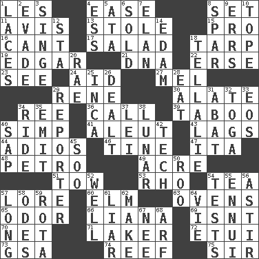 ACROSS 1. French article 4. Comfort 8. Arrange properly for use 11. Advice 13. Took without asking 15. Adept person 16. Patter 17. Vegetable dish 18. Canvas cover 19. _ Allan Poe 21. Heredity factor (abbr.) 22. Celtic language 23. Observe 24. Help 27. Cartoonist voice _ Blanc 29. French philosopher Descartes 30. Having winglike extensions 34. To separate or throw off 36. Give a ring to 39. Off limits 40. Simple or foolish person 41. Native American of Southwest Alaska 43. Straggles 44. Goodbye (Sp.) 46. Prong on a fork 47. Call ___ day 48. Stone: prefix 49. Measure of real estate 51. Pull behind 53. 17th letter of the Greek alphabet 54. Beverage made from leaves 57. Old wives' tales, e.g. 60. Shade tree 63. Baking chambers 65. Aroma 66. Climbing, woody, usually tropical vines 69. Is not 70. Remaining after all deductions 71. Member of a famous L.A. basketball team 72. Needle case 73. Girls' org. (abbr.) 74. Coral ridge 75. Title for a knight DOWN 1. Shoestrings 2. Elude 3. Scorch 4. Curvy letter 5. "One Day ___ Time" 6. Exchanged or delivered for money 7. Style 8. Coast Guard woman 9. Blunders 10. Drink excessively 12. R.R. building 14. Dutch treat 18. Copy Pinocchio 20. Actress Charlotte 25. South American Indian 26. Started a card game 28. Consume 29. Newsperson 31. Blind as ____ 32. Ancient Roman robe 33. Greek goddess of the dawn 34. Travel on or in a vehicle 35. Give off 37. Flowery wreath 38. Type of eclipse 40. Plant excrement 42. Technical work 45. "Barney Miller" actor Jack 50. Friend of Pooh 52. Water source 54. Trials 55. World-weariness 56. Having gotten out of bed 57. Having great length 58. Lyric poems 59. Roll call or roster of names 61. One who doesn't tell the truth 62. Cause to be 64. Compete 67. Born 68. Sandy's bark