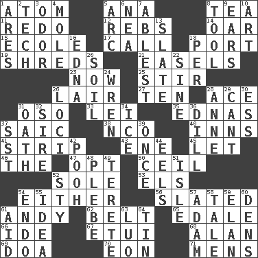 ACROSS 1. Smallest unit of an element 5. Santa ___, CA 8. Afternoon social gathering 11. Do over again 12. Confederate soldiers (slang) 14. Boat paddle 15. Learning spot: Fr. 17. Give a ring to 18. Left side of a ship or aircraft 19. Tears up 21. Artist's stands 23. Immediately 25. Agitate 26. Den 27. Nine, plus one 28. Adept person 31. Bear (Spanish) 33. Luau accessory 35. Ferber et al. 37. Ketch in the Levant 38. Non-commissioned officer (abbr.) 40. Taverns 41. Remove all contents or possession from 43. Compass dir. 45. Allow 46. Definite Article 47. Elect 50. To provide with a ceiling 52. Flatfish 53. Raised railways 54. One or the other of two 56. Scheduled 61. "60 Minutes" Commentator Rooney 62. Waist strap 65. Peak District village in England 66. Binary compound 67. Needle holder 68. Actor Alda or Thicke 69. ___ good deed 70. Period of immesurable duration 71. Not women's DOWN 1. Ancient Greek god of war 2. Technician 3. Scent 4. Undercover agent 5. Curve 6. Teachers' org. 7. Most capable 8. Implement 9. Hearing organs 10. Nonscientific branch of learning 13. Schedule 16. Pulitzer Prize-winning author Ferber 18. For each 20. Earth 22. Trig term 24. Songbird 26. Locales 28. Queen of England 1702-14 29. Patter 30. Curvy letter 31. Pledge 32. The founder of a family 34. Frozen water 36. Deli pickle 37. Fast jet (abbr.) 39. At one time in the past 42. "Silly old bear" 44. Snakelike fish 48. Cadet 49. Cylindrical with tapered ends 51. Small island 52. Filthy place 54. Inside; within (prefix) 55. The content of cognition 57. First of billions? 58. Falsehood 59. Flair 60. Cub Scout units 61. Assist 63. Nilotic language 64. Metal container