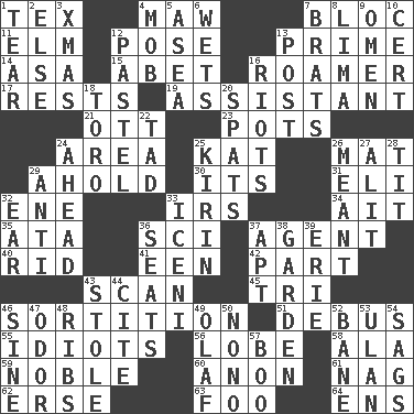 ACROSS 1. John Ritter's dad 4. Opening into something insatiable 7. Alliance 11. Shade tree 12. Introduce or present, as a question 13. A-one 14. White ___ sheet 15. Collude with 16. Nomad 17. Musical pauses 19. Aide 21. Baseball player Mel 23. Plant holders 24. Length times width 25. Krazy ___ of comics 26. Floor covering 29. Hold, grip (Informal) 30. ___ a Wonderful Life 31. Connecticut Ivy Leaguer 32. Compass dir. 33. Big collection agency 34. Small island 35. _ moment's notice (2 wds.) 36. _-fi 37. Representative 40. To free from 41. Car or cant ending 42. Component 43. Glance over 45. Three (prefix) 46. Casting lots 51. Alight from a bus 55. Foolish or stupid persons 56. Ear part 58. Insect wing 59. Having high moral qualities 60. At once, immediately (arch.) 61. Tired old horse 62. Celtic language 63. Egg _ yung 64. Followers of ems DOWN 1. Separate forcefully 2. Otherwise 3. Dec. holiday 4. Disorderly crowd 5. At sea 6. Soaks 7. Naughty children 8. Pale green bean 9. Sign of things to come 10. An absolute certainty 12. Soft color 13. Mail 16. Debaucheries 18. "Corrida" creature 20. Arguments over trivial matters 22. Bit 24. Having the leading position 25. Japanese brewing company 26. Intended 27. Came down and settled, as after flight 28. Teat (slang) 29. Opposed to 32. Hearing organ 33. Ancient Celtic tribe of eastern Britain 36. Theater features 37. Fitting 38. Place where plants grow 39. 4th largest of the Great Lakes 43. Fur scarf 44. Quote 46. Trig term 47. Scent 48. Teases 49. Norwegian king 50. Words to Nanette 52. Object of repulsion 53. ____ Bator 54. Droops 57. Surprise greeting