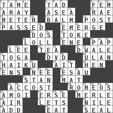 ACROSS 1. Docile 5. Small boy 8. Opposite of masc. 11. Like ___ of sunshine 12. At sea 14. Actress Charlotte 15. Distance measurement 17. Lip ointment 18. Mail 19. Went by 21. Develop 23. Two (Sp.) 25. Puff or smoke 26. Hang loosely or laxly 27. Compass dir. 28. Infant food 31. Area sheltered from the wind 33. Beverage made from leaves 35. A sleeping potion; an opiate (poet.) 37. Ancient Roman robe 38. Movie disc 40. ____ Bator 41. Japanese verse 43. Small island 45. Layer 46. Followers of ems 47. Born 50. Son of Isaac 52. Comedian Laurel of Laurel & Hardy 53. Floor covering 54. Buttonhole 56. Lover boys 61. Mine, in Marseilles 62. Celtic language 65. Haggard of country music 66. Atmosphere 67. Allows 68. Mediterranean tributary 69. Say or write further 70. Consume 71. Lick closed DOWN 1. Pack (down) 2. Length times width 3. Floor coverings 4. Snake ____ (dice throw) 5. Bar bill 6. White ___ sheet 7. Erase 8. Tree-dwelling hopper 9. Relaxation 10. Was introduced to 13. ID or VA city 16. Make new 18. Before (prefix) 20. Dunce 22. Supplemented with great effort 24. Downhill vehicle 26. Path through which fluid escapes 28. Diluted with white 29. Actor Alda or Thicke 30. Fenced enclosure 31. Grant temporary use of 32. The front part of a cuirass 34. Actress Gardner 36. Chinese city south-southwest of Nanjing 37. Definite Article 39. South Vietnam president (1954) 42. To (old English) 44. Russian ruler of old 48. Artist's stand 49. Main course 51. Smallest unit of an element 52. _-fi 54. Among 55. Drawstring 57. Not women's 58. 4th largest of the Great Lakes 59. Water jar 60. Sew up the eyelids of hawks and falcons 61. American Automobile Association (abbr.) 63. R.R. building 64. Eastern Standard Time (abbr.)