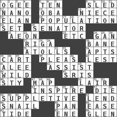 ACROSS 1. Double curve, resembling the letter S 5. "___ Little Indians" 8. Downhill vehicle 12. Billionth: prefix 13. Chief or king in Benin or Nigeria 14. Sibling's daughter 15. Style 16. Census information 19. Put into a specified state 20. Legislator 21. A really long time 23. And so on (abbr.) 24. Separate the seeds from cotton 27. Port city in Latvia 30. Object of repulsion 31. Ringlike coral islands and reefs 34. Tenement units (abbr.) 35. Draw slowly or heavily 38. Entreaties 40. For fear that 41. Toward shelter 42. Aid 44. Uncontrolled 45. Indian titles of respect 46. Filthy place 47. Atlas unit 50. Den 53. Heighten or intensify 57. Pass on 59. Supplying deficiencies 63. Grant temporary use of 64. Slow-paced one 65. Baking dish 66. Comfort 67. Event that recurs at intervals 68. Compass dir. 69. Small, secluded valley DOWN 1. Singles 2. An organ shaped like a helmet 3. Related on the mother's side 4. Period of immesurable duration 5. Drink excessively 6. Inky black, to poets 7. California wine valley 8. Be seated 9. Luau accessory 10. Environmental prefix 11. Lair 14. Drug cop 17. Shoshoni 18. Car dealer's back yard 20. In a ____ (agitated or irritated) 22. Declaimed 24. Yawn 25. Pismires 26. A home for chicks 28. Grand Old Party 29. Silent film actress Nazimova 30. Greek mezzo-soprano Agnes 32. French article 33. Backtalk 35. Crow sounds 36. Came down and settled, as after flight 37. Trust 39. Title for a knight 43. Filth; sediment 47. Place where flour is made 48. A saturated hydrocarbon 49. Pacific Standard Time (abbr.) 51. Perfect 52. Wash lightly 54. Corncob 55. "Terrible" tsar 56. French philosopher Descartes 58. Genesis locale 59. Fast jet (abbr.) 60. University (slang) 61. Writing tablet 62. Sliced dessert 63. Part of a journey