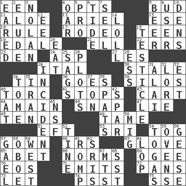 ACROSS 1. Car or cant ending 4. Chooses 8. Partially opened flower 11. _ vera 13. Satellite of Uranus 15. Compass dir. 16. General guideline 17. Cowboy competition 18. Adolescent 19. Peak District village in England 21. Pipe bend 22. Blunders 23. Lair 24. Cleo's killer 27. French article 29. Slanted text style (abbr.) 30. Showing deterioration from age 34. Metal container 36. Travels 39. Grain storage towers 40. Torque (variant) 41. Obstructs or blocks passage 43. Draw slowly or heavily 44. With great haste 46. Fastener 47. Untruth 48. Watches over 49. Not wild 51. Bank Draft (abbr.) 53. Indian title of respect (Mr.) 54. Coat; cloak 57. Bride's dress 60. Big collection agency 63. Michael Jackson trademark 65. Collude with 66. Typical models 69. Double curve, resembling the letter S 70. Greek goddess of the dawn 71. Gives off 72. Baking dishes 73. Allow 74. Inconspicuous attention getter 75. Compass dir. DOWN 1. Having ears or earlike features 2. Evade 3. Pitcher Ryan 4. Boat paddle 5. Adept person 6. Event that recurs at intervals 7. Sew up the eyelids of hawks and falcons 8. Fermented drink made from hops 9. One who makes use of a thing 10. Cub Scout units 12. Snakelike fish 14. Hang loosely or laxly 18. One of the two male reproductive glands 20. Erode 25. Settles 26. Graphs 28. Curvy letter 29. Happening 31. Mountain range southwest of Kyrgyzstan 32. Old wives' tales, e.g. 33. Eastern Standard Time (abbr.) 34. Heavy book 35. SW Asia republic 37. Period of immesurable duration 38. Arguments over trivial matters 40. Make lace 42. Coast Guard woman 45. Overdraft (abbr.) 50. Russian fighter aircraft 52. Prong on a fork 54. Ancient Roman robes 55. Baking chambers 56. Honkers 57. Highlander 58. Mitch Miller's instrument 59. Compass direction 61. Play 62. Indian titles of respect 64. Chop off 67. Mountains (abbr.) 68. Fast jet (abbr.)