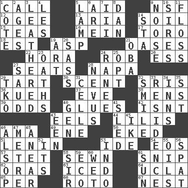 ACROSS 1. Give a ring to 5. Put down 9. Overdraft (abbr.) 12. Double curve, resembling the letter S 13. Roberta Peters solo 14. The visible part of the earth's surface 15. Beverages made from leaves 16. Chow _ 17. "Corrida" creature 18. Eastern Standard Time (abbr.) 19. Viper 21. Fertile tracts in a desert 22. Israeli folk dance 24. Director Reiner 26. Double-curved letter 27. Theater features 28. California wine valley 29. Small pie 30. Odor 32. Indian titles of respect 36. Malaysian steamed pastry 37. Night before a holiday 38. Not women's 39. Likelihood 40. Adhesives 42. Is not 43. Snakelike fish 44. Ms. Damita and namesakes 46. Nanny (var.) 49. Compass dir. 50. Made supply last 51. Soviet premier 1918-24 53. Binary compound 54. Greek goddess of the dawn 57. Proofreading order 58. Stitched 61. Sever or remove by pinching or nipping 62. Mouths or openings 63. On the rocks 64. Southern CA. univ. 65. For each 66. Printing process, for short 67. A home for chicks DOWN 1. ____ d'Azur (French Riviera) 2. Eons 3. Resembling or made to resemble leather 4. French article 5. Desk light 6. "We ___ not amused" (Victoria) 7. One more than two 8. Daniel's nick name 9. Trap for birds or small mammals 10. Begets 11. Soft thread for cleaning between teeth 14. R.R. building 19. Nonscientific branch of learning 20. Backtalk 21. Chief or king in Benin or Nigeria 23. Profane or obscene expressions 24. The wife of a rajah (variant) 25. Choose 27. Saudi Arabian king (1953-1964) 28. Congenital growth or mark on the skin 29. Ring climax 31. Cell (Danish) 32. Grin 33. Home 34. Restaurants 35. Fast jet (abbr.) 40. Commissioned mil. rank 41. Downhill vehicle 43. Car or cant ending 45. D.D.E's nickname 46. Columnist Joseph or Stewart 47. Distance measurement (Brit.) 48. Approach 52. ___ a Wonderful Life 53. Southeast Asian peninsula 55. Lubricates 56. Petty quarrel 58. Title for a knight 59. Environmental prefix 60. Dripping 61. Player for Phoenix