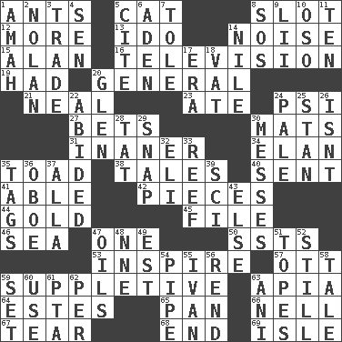 ACROSS 1. Pismires 5. Domesticated feline 8. Notch 12. Greater amount 13. Wedding promise 14. Annoying sound 15. ____ Jay Lerner 16. Household entertainment appliance 19. Possessed 20. Commissioned military rank 21. Be tempered by heat 23. Had dinner 24. Air pressure measure (abbr.) 27. Wagers 30. Floor coverings 31. Sillier 34. Style 35. Frog relative 38. Lies 40. Transmitted 41. Competent 42. Parts 44. Gilded 45. Do some clerical work 46. Ocean 47. Single 50. Fast planes 53. Motivate 57. Baseball player Mel 59. Supplementary 63. Capital of Western Samoa 64. _____ Park, CO 65. Baking dish 66. 1994 drama film starring Jodie Foster 67. Pull into pieces 68. Conclude 69. Capri or Wight DOWN 1. Housemaid 2. Pitcher Ryan 3. Swap 4. Elected rep. 5. Quote 6. An important port of Yemen 7. Lacquered or enameled metalware 8. Distress signal 9. Cards in a Roman deck? 10. Bear (Spanish) 11. Nine, plus one 14. "Death on the ____" 17. Epoch 18. Large container 20. Small, secluded valley 22. Tolerated 24. Light colored 25. Comedian Laurel of Laurel & Hardy 26. Is not 28. Make lace 29. Fastener 30. Makes clutter 32. Biblical high priest 33. Coral collection 35. Labels 36. Mitch Miller's instrument 37. Silent film actress Nazimova 39. _-fi 43. Otherwise 47. Petroleums 48. Compass dir. 49. Eastern Standard Time (abbr.) 51. Drinks excessively 52. Not moving 54. Corncob 55. "Terrible" tsar 56. Tear apart 58. Story 59. Put into a specified state 60. Purpose 61. Parent Teacher Assoc. 62. For each 63. Cuckoo