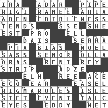 ACROSS 1. Lyricist Gershwin 4. The sixth month of the Jewish calendar 8. Corncob 12. Swiss mountan, "Queen of the Mountains" 14. The wife of a rajah (variant) 16. Operatic vocal solo 17. An important port of Yemen 18. The property of being fit to eat 20. Is inclined (to) 22. Compass dir. 23. A female animal or person 24. Eastern Standard Time (abbr.) 25. Adept person 28. Pipe bend 30. Raised platform 31. Father Junipero _ 35. Parent Teacher Assoc. 37. Prejudice 40. Christmas carol 41. Backtalk 42. Sir (Sp.) 44. Spanish pot 45. Mouths or openings 46. Painter Guido (1575-1642) 47. Marina Del _, California 48. Long narrow piece of something 50. Edge tool used to cut and shape wood 52. Shade tree 54. To sift 55. Adept person 58. Environmental prefix 61. Hearing organ 63. Artist's stand 65. Frustrating wastes of time 70. Small island 71. Proofreading order 72. Incident 73. Baby powder 74. Snake ____ (dice throw) 75. Whirlpool 76. Was introduced to DOWN 1. Feeling or showing extreme anger 2. Amusement-park features 3. Representative 4. "We ___ not amused" (Victoria) 5. June honoree 6. Cuckoo 7. Confederate soldiers (slang) 8. Baking dish 9. Angers 10. Expression of disdain 11. Comfort 13. Working for oneself (abbr.) 15. Otherwise 19. Snakelike fish 21. Health resort 26. Teases 27. Flexible twig of a willow tree 29. Poe poem 30. Hyrax 32. Hero or heavy, e.g. 33. Have confidence or faith in 34. In the manner of 35. Component 36. Russian ruler of old 38. A saturated hydrocarbon 39. Echolocation 41. Distress signal 43. Travel on an animal 49. Entreaty 51. Last letter of the English alphabet 53. Female horse 55. Indian state 56. Cell (Danish) 57. Opt 58. Celtic language 59. Municipality 60. Double curve, resembling the letter S 62. Be footloose 64. Small island 66. Mountains (abbr.) 67. Directed 68. Conclusion 69. Filthy place