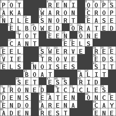 ACROSS 1. Cooking vessel 4. Painter Guido (1575-1642) 8. I made a mistake 12. Alias (abbr.) 13. Make _____ (do battle with) 14. Riding implement 15. "Death on the ____" 17. Derisive sound 18. Relaxation 19. Shoved, as through a crowd 21. Declaimed 23. Small child 24. Car or cant ending 26. Single 27. Patter 28. Snakelike fish 30. Snakelike fish 31. Turn aside suddenly 34. To separate or throw off 37. Compete 38. Collection of objects 39. Begley and Asner 40. Raised railways 41. Annoying sounds 42. Be seated 43. Water vessel 44. Came down and settled, as after flight 46. Put into a specified state 47. Curvy letter 50. To free from 51. Pressed 54. Winter's stalactites 57. Habitations of wild animals 58. Eroded 60. Single time 62. Inside; within (prefix) 63. Sports stadium 64. Island 65. Arabian gulf 66. Respite 67. Compass dir. DOWN 1. Baking dish 2. Migrant worker of the '30s 3. Baron Munchausen's specialties 4. The wife of a rajah (variant) 5. Eat (away) 6. Not either 7. To the inside or interior of 8. Seas 9. Speak pompously 10. Introduce or present, as a question 11. Drove too fast 13. Compass dir. 16. Inky black, to poets 20. Baseball player Mel 22. Hero or heavy, e.g. 25. Effrontery 27. To provide with a ceiling 29. Nights before holidays 30. Night before a holiday 31. Portico 32. Compose 33. Greek goddess of the dawn 34. Dwelling 35. Prepare for publication 36. Eastern Standard Time (abbr.) 41. Brief written record 43. Gillaume's butler role 44. Curve 45. _ and Stitch 46. Message 48. Settings 49. Aroma 51. It may be bright or harebrained 52. Tear apart 53. Letter starter 55. _ tizzy (2 wds.) 56. Skim 59. "We ___ not amused" (Victoria) 61. Sight organ