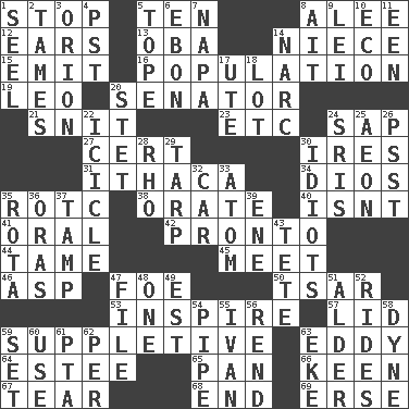 ACROSS 1. Constrict 5. Nine, plus one 8. Toward shelter 12. Hearing organs 13. Chief or king in Benin or Nigeria 14. Sibling's daughter 15. Give off 16. Census information 19. Lion 20. Legislator 21. In a ____ (agitated or irritated) 23. And so on (abbr.) 24. Plant excrement 27. An absolute certainty 30. Angers 31. New York city 34. "Vaya con ____" 35. College mil. group 38. Declaim 40. Is not 41. Spoken 42. Right away 44. Docile 45. Confront 46. Cleo's killer 47. Enemy 50. Russian ruler of old 53. Motivate 57. Flaplike covering 59. Supplying deficiencies 63. Whirlpool 64. First name in cosmetics 65. Baking dish 66. Peachy ____! 67. Rend 68. Conclusion 69. Celtic language DOWN 1. Stitch closed the eyes of (a falcon) 2. Corrects by punishment or discipline 3. Constellation of myth 4. Pacific Standard Time (abbr.) 5. Drink excessively 6. Inky black, to poets 7. California wine valley 8. Small island 9. Luau accessory 10. Environmental prefix 11. Car or cant ending 14. Drug cop 17. Shoshoni 18. Car dealer's back yard 20. Proofreading order 22. Ice on the eave 24. Indian titles of respect 25. Period of immesurable duration 26. Inconspicuous attention getter 28. 17th letter of the Greek alphabet 29. Canvas cover 30. Foolish or stupid persons 32. 4-wheeled motor vehicle 33. Tiny particle 35. Round or rotation of duties 36. Mouths or openings 37. Pack (down) 39. Compass dir. 43. False hair 47. Do some clerical work 48. Single 49. Eastern Standard Time (abbr.) 51. Tree or shrub in the Birch family 52. Amusement-park features 54. Corncob 55. "Terrible" tsar 56. Tear apart 58. Unit of force 59. Arrange properly for use 60. Purpose 61. Parent Teacher Association (abbr.) 62. For each 63. Supplement with great effort