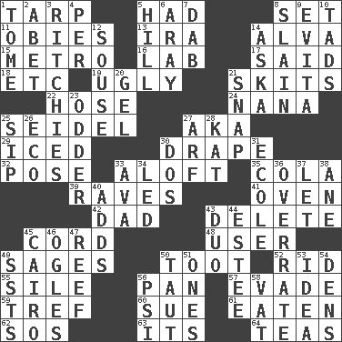 ACROSS 1. Canvas cover 5. Possessed 8. Arrange properly for use 11. Off-Broadway awards 13. Retirement account (abbr.) 14. Inventor's middle name 15. Paris' subway 16. Experiment locale 17. Stated 18. And so on (abbr.) 19. Repulsive 21. Burlesque acts 22. Stockings 24. Grandmother 25. Beer mug 27. Alias (abbr.) 29. On the rocks 30. Window treatment 32. Airs 33. Upward 35. Root beer relative 39. All-night dance parties 41. Baking chamber 42. Male parent 43. Keyboard key 45. Drawstring 48. One who uses or employs something 49. Gurus 50. A blast of a horn 52. To free from 55. Filth; sediment 56. Baking dish 57. Elude 59. Unclean, religiously 60. Institute legal proceedings 61. Ingested 62. Mayday 63. ___ a Wonderful Life 64. Afternoon social gatherings DOWN 1. Heavy book 2. Collude with 3. Actors Guy, Robert Welles, and Clint 4. For each 5. Land elevation 6. Like ___ of sunshine 7. Pat or tap gently 8. Killed 9. Webber/Rice musical 10. Small amounts or degrees 12. Boozer 14. "____ silly question..." 20. Set 21. Fastener 23. More peculiar 25. Small drink 26. Environmental prefix 27. Sandy's bark 28. Krazy ___ of comics 30. Two (Sp.) 31. Learning spot: Fr. 33. Actress Gardner 34. Directed 36. Make much ado about nothing 37. Allow 38. One (Scot) 40. Does sums 43. Superhero pair 44. First name in cosmetics 45. Capital of Egypt 46. Stares 47. Coral collection 49. Fast planes 50. Pulled tight 51. Washington bills 53. The content of cognition 54. Hiding places for outlaws 56. Air pressure measure (abbr.) 58. Large container