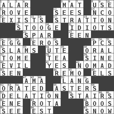 ACROSS 1. Having or resembling wings 5. Floor covering 8. Purpose 11. Be footloose 12. Observes 13. Non-commissioned officer (abbr.) 14. Is 17. Ski resort town in Vermont 19. Moe Howard, for one 21. Foolish or stupid persons 22. Practice fight 23. Car or cant ending 24. Oval reproductive body of a fowl 27. Greek god of love 29. Personal Computers (abbr.) 32. Criticizes harshly 34. Shoshoni 36. Relating to the mouth 37. Heavy book 38. Afternoon social gathering 39. Trig term 40. Tending to cause great harm 41. It is so 42. Wanderer 43. Elected rep. 44. San ____ (Riviera town) 46. Raised railways 47. Nursemaid (var.) 50. Long (Scottish) 52. Spoke pompously 55. Michaelmas daisies 57. Accusation by an informer 59. Flight of steps 62. Compass dir. 63. Round or rotation of duties 64. Scornful sounds 65. Observe 66. Eastern Standard Time (abbr.) 67. Overwhelm DOWN 1. "We ___ not amused" (Victoria) 2. Brine-cured salmon 3. Advice 4. Musical pauses 5. Was introduced to 6. Nest on high 7. Sadhe (variant) 8. To (old English) 9. Native of Scotland 10. Immeasurably long periods of time 12. Compass dir. 15. Drinks excessively 16. Fly high 18. Metal container 20. Sullen 24. _____ Park, CO 25. Michael Jackson trademark 26. Street urchin 28. Bull 29. First class 30. Lessep's creation 31. Bobsleighs 33. Cartoonist voice _ Blanc 35. Artist's stands 36. Bear (Spanish) 42. Music written for nine 45. Floor coverings 47. _ moment's notice (2 wds.) 48. Distance measurement (Brit.) 49. Goodbye (Sp.) 51. Catches 52. Lyric poems 53. French philosopher Descartes 54. Toward shelter 55. Santa ___, CA 56. The Jewish people; Israel 58. Baseball player Mel 60. Friend of Pooh 61. Compass dir.