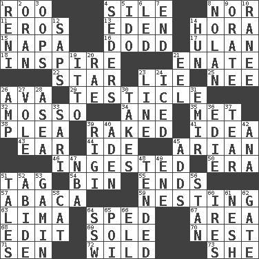 ACROSS 1. Friend of Pooh 4. Drop; flow; fall 8. And not 11. Greek god of love 13. Locale of original sin 14. Israeli folk dance 15. California wine valley 16. Texas town _ City 17. ____ Bator 18. Stimulate to action 21. Maternal 22. Play the lead 23. Untruth 25. Born 26. Actress Gardner 29. One of the two male reproductive glands 32. With motion or animation 34. One (Scot) 35. Was introduced to 38. Entreaty 39. Swept the length of 41. The content of cognition 43. Hearing organ 44. Binary compound 45. Believer in; advocate of (suffix) 46. Consumed 50. Period 51. Label 54. Storage container 55. Conclusions 57. Phillipine bananalike plant 59. Snuggling 63. Pale green bean 64. Broke a traffic law 67. Length times width 68. Prepare for publication 69. Not divided or shared with others 70. A home for chicks 71. Elected rep. 72. Uncontrolled 73. A female animal or person DOWN 1. Painter Guido (1575-1642) 2. Northwest Algerian city 3. I made a mistake 4. Spring feasts 5. Wedding promise 6. Directed 7. Conclude 8. Pitcher Ryan 9. Declaim 10. Indian princess (variant) 12. Plant excrements 14. Attila the _ 19. "Tell ____ the Marines!" 20. Actress Charlotte 21. Snakelike fish 23. Actor's bit 24. On the rocks 26. Electrical Unit 27. Grand slam 28. At sea 30. Proceeds 31. Arab leader 33. Indian skirt 36. Singer Brickell 37. Rend 39. Swiss mountan, "Queen of the Mountains" 40. Arabian gulf 42. Santa ___, CA 45. Sums up 47. Basketball assoc. 48. Watched over 49. Compass dir. 51. Stories 52. Stay 53. Street urchin 56. Comedian Laurel of Laurel & Hardy 58. Feline 60. Angers 61. Soft 62. Yard entry 64. Compass dir. 65. Luau course 66. Pipe bend
