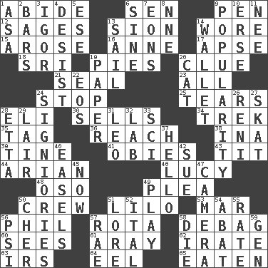 ACROSS 1. Tolerate 6. Elected rep. 9. Writing instrument 12. Gurus 13. The Jewish people; Israel 14. Had on 15. Came up 16. Queen of England 1702-14 17. Domed church section 18. Indian title of respect (Mr.) 19. Sliced desserts 20. A slight indication 21. Lick closed 23. Everything 24. Discontinue 25. Pulls into pieces 28. Connecticut Ivy Leaguer 30. Exchanges for money 34. Long journey 35. Label 36. Arrive at 38. _ tizzy (2 wds.) 39. Prong on a fork 41. Off-Broadway awards 43. Teat (slang) 44. Believer in; advocate of (suffix) 46. "I Love _" 48. Bear (Spanish) 49. Entreaty 50. Group working together 51. _ and Stitch 53. Third mo. 56. Silvers or Donahue 57. Roll call or roster of names 58. Debunk (Brit. slang) 60. Observes 61. Like ___ of sunshine 62. Feeling or showing extreme anger 63. Big collection agency 64. Snakelike fish 65. Eroded DOWN 1. White ___ sheet 2. Oblong pieces of solid material 3. Russian composer Stravinsky 4. Cease 5. Compass dir. 6. Trig term 7. Immeasurably long periods of time 8. Compass dir. 9. Teen's desire 10. Celtic language 11. Born 13. Travel by water 14. Place for singles 19. Some stationery 20. Feline 22. Greek goddess of the dawn 24. Seigniories (variant) 26. Painter Guido (1575-1642) 27. Three-handed card game 28. Singer James 29. Den 31. Lion 32. Experiment locale 33. _-fi 37. Phone greeting 40. Artist's stands 42. Take to court 45. At this time 47. Device for capturing images 49. Live dramatic performance 50. "Mermaids" star 51. Old wives' tales, e.g. 52. Slanted text style (abbr.) 54. Blind as ____ 55. Pace 56. 23rd letter of the Greek alphabet 57. Actress Charlotte 58. Pass on 59. Commissioned mil. rank