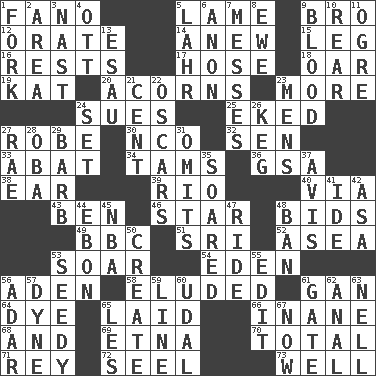 ACROSS 1. Papal veil 5. Unable to walk 9. Sis' sibling 12. Declaim 14. Afresh 15. Part of a journey 16. Musical pauses 17. Stockings 18. Rowing implement 19. Krazy ___ of comics 20. Oak nuts 23. Greater amount 24. Takes to court 25. Made supply last 27. Loose flowing garment 30. Non-commissioned officer (abbr.) 32. Elected rep. 33. Blind as ____ 34. Scottish caps 36. Girls' org. (abbr.) 38. Hearing organ 39. _ de Janeiro 40. By way of 43. Benjamin's nick name 46. Play the lead 48. Auction offers 49. English channel? 51. _ Lanka 52. Toward the sea 53. Fly high 54. Paradise 56. Arabian gulf 58. Evaded 61. Separate the seeds from cotton 64. Color 65. Put down 66. Lacking in sense or substance 68. Added to 69. Inactive volcano in Sicily 70. "_____ Recall" 71. Marina Del _, California 72. Sew up the eyelids of hawks and falcons 73. Not ill DOWN 1. Tined utensil 2. Type of rug 3. Political cartoonist Thomas 4. Baseball player Mel 5. Cowardly lion portrayer 6. Soon (poet.) 7. Makes clutter 8. She-sheep 9. Vital fluid 10. Stern 11. Legendary monster 13. Son of Isaac 21. Penny 22. Motion picture awards 23. Not women's 24. Arrange properly for use 26. Cask 27. Actress Charlotte 28. Chief or king in Benin or Nigeria 29. Sharp remark 31. Leaves out 35. Flew 37. Advice 41. Binary compound 42. White ___ sheet 44. Inky black, to poets 45. Basketball assoc. 47. Travel on an animal 48. Prohibit 50. Cause to be 53. Morally degraded 55. Prepare for publication 56. The sixth month of the Jewish calendar 57. Unit of force 59. Actor's bit 60. Hereditary estate 61. Yard entry 62. Of or related to the anus 63. 1994 drama film starring Jodie Foster 65. French article 67. At this time