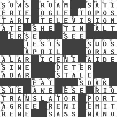 ACROSS 1. Sty mamas 5. Wander 9. Suttee (variant) 13. 4th largest of the Great Lakes 14. Stare at amorously 15. Literary convention 16. Small pie 17. Boob tube 19. Had dinner 20. A female animal or person 21. Metal container 22. Keyboard modifier key 23. Celtic language 25. Perceive with the eye 26. Trials 30. Beer foam 34. Showery time 35. Mouths or openings 36. Having or resembling wings 39. Ancient Celtic tribe of eastern Britain 42. Assistant 43. Trig term 44. Prevent from occurring 46. The sixth month of the Jewish calendar 47. Having lost freshness 48. Ingest 51. Neighbor of Neb. 54. Take to court 57. Deep reverence 58. Compass dir. 60. River (Sp.) 62. Interpreter 65. Left side of a ship or aircraft 66. Match 67. Painter Guido (1575-1642) 68. Give off 69. French philosopher Descartes 70. Backtalk 71. Billionth: prefix DOWN 1. Bristle 2. Declaim 3. One who wires 4. Arrange properly for use 5. Writer of Portnoy's Complaint (1969) 6. Double curve, resembling the letter S 7. 100% 8. Confronts 9. Mayday 10. Capital of Western Samoa 11. Implement 12. Is not 15. Prong on a fork 18. Compete 20. Ooze 24. A viewer who gazes fixedly 27. _ Lanka 28. Nervous spasm 29. Bobsleighs 30. Flew 31. RI univ. 32. June honoree 33. Compass dir. 36. White ___ sheet 37. Hat (slang) 38. Santa ___, CA 40. Remaining after all deductions 41. Call ___ day 45. Otherwise 48. Relaxation 49. Leather borer 50. Pulls apart 52. Scent 53. Japanese brewing company 54. Play the lead 55. Goad 56. Merit 58. Immeasurably long periods of time 59. Indian titles of respect 61. "Beetle Bailey" pooch 63. Born 64. Afternoon social gathering 65. Writing instrument