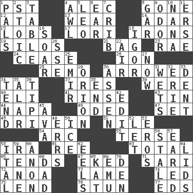 ACROSS 1. Pacific Standard Time (abbr.) 4. Actor Baldwin 8. Went 12. "One Day ___ Time" 13. Erode 14. The sixth month of the Jewish calendar 15. Tennis shots 17. Australian parrot (variant) 18. Removes the wrinkles 19. Grain storage towers 21. Paper or plastic container 23. Actress Charlotte 24. Desist 26. Electrically charged atom 28. San ____ (Riviera town) 30. Moved like an arrow 34. Make lace 37. Angers 39. We are 40. Biblical high priest 41. Wash lightly 43. Metal container 44. California wine valley 46. Wrote a lyric poem 47. Arrange properly for use 48. Popular '50s hangout 51. "Death on the ____" 54. Curve 55. Laconic 58. Retirement account (abbr.) 61. To sift 63. Add up to 65. Is inclined (to) 67. Made supply last 71. Indian skirt 72. Small Philippine buffalo 73. Unable to walk 74. Directed 75. Grant temporary use of 76. Astound 77. Begley and Asner DOWN 1. Friends 2. Unemotional 3. Eating place 4. Leather borer 5. Lion 6. Ewer handle 7. Baby bed with high sides 8. Slender fish 9. Scent 10. Nanny 11. Celtic language 16. Fly high 18. Russian composer Stravinsky 20. Compass dir. 22. Atmosphere 25. Arab leader 27. Immediately 29. Greek mythologigal hunter 30. NE Netherlands city 31. Soaks 32. 4th largest of the Great Lakes 33. Gouge 34. Look after 35. Having or resembling wings 36. Native american tent (variation) 38. Conclude 42. Prepare for publication 45. Actress Gardner 49. Blunders 50. Frozen water 52. Allow 53. Greek god of love 56. Having lost freshness 57. Having ears or earlike features 58. Slanted text style (abbr.) 59. French philosopher Descartes 60. At once, immediately (arch.) 62. Snakelike fish 64. Hats (slang) 66. June honoree 68. Krazy ___ of comics 69. Australian flightless bird 70. Lair