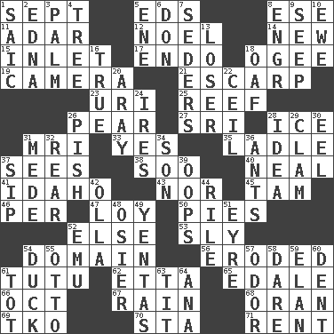 ACROSS 1. Back-to-school mo. 5. Begley and Asner 8. Compass dir. 11. The sixth month of the Jewish calendar 12. Christmas carol 14. ___ Haven, CT 15. An arm off of a larger body of water 17. Inside; within (prefix) 18. Double curve, resembling the letter S 19. Device for capturing images 21. Fortification 23. RI univ. 25. Coral collection 26. Lightbulb-shaped fruit 27. Indian title of respect (Mr.) 28. Frozen water 31. Medical imaging device (abbr.) 33. It is so 35. Dipping utensil 37. Observes 38. "Barney Miller" actor Jack 40. Actress Patricia 41. Potato state 43. Not either 45. Scottish cap 46. For each 47. Myrna of the movies 50. Sliced desserts 52. Otherwise 53. Insidious 54. Kingdom 56. Worn away 61. Ballerina skirt 62. Singer James 65. Peak District village in England 66. Sep. follower 67. Precipitation 68. NW Algerian seaport 69. Ring climax 70. R.R. building 71. Monthly bill DOWN 1. Ketch in the Levant 2. Pulitzer Prize-winning author Ferber 3. Inside of hand 4. Relationship diagram 5. Compass dir. 6. Spanish title 7. Spring feasts 8. Engineer (abbr.) 9. Ooze 10. She-sheep 13. Failure 16. Loyal 18. Clumsy lout 20. Like ___ of sunshine 22. To provide with a ceiling 24. Angers 26. Expression of disdain 28. It may be bright or harebrained 29. Burrowing marine mollusk 30. Snakelike fish 31. Ancient Persian 32. Hitchcock's "____ Window" 34. Boy, to dad 36. Pismires 37. Small drink 39. I made a mistake 42. Rounded earthenware pot or jar 44. Cause heat under the collar 48. Flexible twig of a willow tree 49. Gossips 51. Jane of fiction 52. Australian flightless bird 54. Evade 55. Von Bismarck 57. Aroma 58. Have the gumption 59. Flair 60. Undesirable depression on a surface 61. Small child 63. Teat (slang) 64. Santa ___, CA