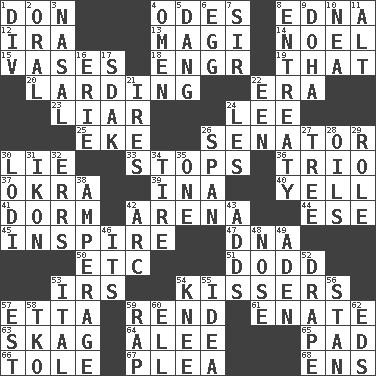 ACROSS 1. Spanish title 4. Lyric poems 8. Pulitzer Prize-winning author Ferber 12. Retirement account (abbr.) 13. Wise men 14. Christmas carol 15. Flower holders 18. Engineer (abbr.) 19. Not this but _ 20. Preparing or cooking with lard 22. Epoch 23. One who doesn't tell the truth 24. Area sheltered from the wind 25. Make supply last 26. Elected representative 30. Whopper 33. Constricts 36. Musical group of three 37. Gumbo ingredient 39. _ tizzy (2 wds.) 40. Shout 41. Dormintory (informal) 42. Sports stadium 44. Compass dir. 45. Stimulate to action 47. Heredity factor (abbr.) 50. And so on (abbr.) 51. Texas town _ City 53. Big collection agency 54. Smoochers 57. Singer James 59. Tear apart 61. Related on the mother's side 63. Heroin 64. Toward shelter 65. Writing tablet 66. Lacquered or enameled metalware 67. Entreaty 68. Followers of ems DOWN 1. HTML Container Element 2. Spoken 3. Rhinal 4. Presage 5. Mild oath, euphamism for damn 6. Oval reproductive body of a fowl 7. Title for a knight 8. Plea 9. Capital of the state of Qatar 10. Teachers' org. 11. Keyboard modifier key 16. 4th largest of the Great Lakes 17. Neighbor of Neb. 21. Angers 22. Car or cant ending 24. French article 26. Connect, as a bridge 27. Woody plant 28. Lubricates 29. Hero or heavy, e.g. 30. Farming town in central California 31. Image 32. Blunders 34. Hoop that covers a wheel 35. Single 38. Electrical Measurement 42. Curve 43. Does sums 46. ___ a Wonderful Life 48. Sense of smell 49. An important port of Yemen 52. Window treatment 53. Slanted text style (abbr.) 54. Leg joint 55. The main thing one is thinking about 56. Comedian Laurel of Laurel & Hardy 57. Eastern Standard Time (abbr.) 58. Ring climax 59. Reproach for some lapse or misdeed 60. Pipe bend 62. Begley and Asner