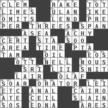 ACROSS 1. Clement's nick name 5. Immoral or dissolute person 9. Small child 12. Citrus fruits 14. ____ Bator 15. Eisenhower's nickname 16. Leaves out 17. Grant temporary use of 18. Before (prefix) 19. For each 20. Triads 23. Connect, as a bridge 24. Toward the sea 25. Painful 27. Certainty 30. R.R. building 32. "Barney Miller" actor Jack 33. Length times width 34. Become fatigued 36. Parent Teacher Association (abbr.) 38. Scottish cap 39. Lubricate 40. Greek goddess of the dawn 43. Baseball player Mel 46. 1994 drama film starring Jodie Foster 48. Common sense 49. _ Lanka 51. Cards in a Roman deck? 52. In a ____ (agitated or irritated) 53. Den 54. Norwegian king 56. Fly high 58. Speaker 61. Luau accessory 64. And so on (abbr.) 65. Of or related to the anus 66. Capital of Egypt 68. Had dinner 69. To provide with a ceiling 70. Killed 71. Distress signal 72. Pulitzer Prize-winning author Ferber 73. Ancient Greek god of war DOWN 1. Hoof sound 2. Citrus frut 3. Arab leader 4. Was introduced to 5. Court order 6. Toward shelter 7. Sunflower state 8. Conclusion 9. Likely to tip or tilt 10. Gumbo ingredient 11. Adolescent 13. Fast planes 21. Behest 22. Food allowance for one day 23. Opportunity 24. _ moment's notice (2 wds.) 26. Police officer (slang) 27. Domesticated feline 28. Period 29. San ____ (Riviera town) 31. Satellite of Uranus 35. American author Paul (1891-1958) 37. Period of immesurable duration 41. Fr. "Yes" 42. Fast jet (abbr.) 44. Russian ruler of old 45. Three (prefix) 47. _ and Stitch 48. Overdraft (abbr.) 50. Pressed 53. Shoestrings 55. Arches 56. Oceans 57. "Beetle Bailey" pooch 59. Precipitation 60. Silent film actress Nazimova 61. One who doesn't tell the truth 62. 4th largest of the Great Lakes 63. Charged particles 65. Adept person 67. According to