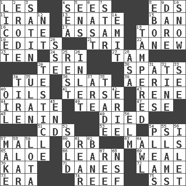 ACROSS 1. French article 4. Perceives with the eye 8. Begley and Asner 11. SW Asia republic 13. Related on the mother's side 15. Prohibit 16. ____ d'Azur (French Riviera) 17. Indian state 18. "Corrida" creature 19. Prepares for publication 21. Three (prefix) 22. Afresh 23. Nine, plus one 24. _ Lanka 27. Scottish cap 29. Adolescent 30. Arguments over trivial matters 34. Third day of the wk. 36. Narrow board 39. Nest on high 40. Petroleums 41. Laconic 43. French philosopher Descartes 44. Feeling or showing extreme anger 46. Pull apart 47. Compass dir. 48. Soviet premier 1918-24 49. Passed on 51. Music discs 53. Snakelike fish 54. Air pressure measure (abbr.) 57. Shopping center 60. Globe 63. Shopping centers 65. _ vera 66. Acquire or gain knowledge or skills 69. Welt 70. Krazy ___ of comics 71. Natives or inhabitants of Denmark 72. Unable to walk 73. Epoch 74. Coral collection 75. Fast jet (abbr.) DOWN 1. It is permitted: Lat. 2. Eat (away) 3. Smooth fabric 4. Ocean 5. Followers of ems 6. Compass direction 7. Play the lead 8. Inky black, to poets 9. Have the gumption 10. Overwhelm 12. Remaining after all deductions 14. Give off 18. ________ with (broke a safety seal) 20. Compass dir. 25. State of inaction 26. An arm off of a larger body of water 28. White ___ sheet 29. One of the two male reproductive glands 31. Ancient Greek god of war 32. Prong on a fork 33. Perceive with the eye 34. Hoop that covers a wheel 35. ____ Bator, Mongolia 37. "We ___ not amused" (Victoria) 38. Sadhe (variant) 40. Lubricate 42. 4th largest of the Great Lakes 45. Conclusion 50. Shade tree 52. Exchanged or delivered for money 54. Entreaties 55. Criticizes harshly 56. Small island 57. Cause to be 58. Having or resembling wings 59. Globular water bottle used in Asia 61. Stern 62. Object of repulsion 64. Leather borer 67. To separate or throw off 68. Science/research agcy.