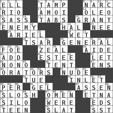 ACROSS 1. Pipe bend 4. Pack (down) 8. Drug cop 12. River (Sp.) 13. Mine, in Marseilles 14. Margarine 15. Backtalk 17. Bar bills 18. Monetary aid 19. Foe 21. Actor Linden 23. Born 24. Satellite of Uranus 26. Dripping 28. Russian ruler of old 30. Commissioned military rank 34. Enemy 37. Ardor 39. Assistant 40. Increase 41. First name in cosmetics 43. Allow 44. Words to Nanette 46. Portable shelter 47. Followers of ems 48. Speakers 51. Naked 54. Third day of the wk. 55. An arm off of a larger body of water 58. For each 61. Set 63. NE Netherlands city 65. Agitate, as a liquid 67. Sign of things to come 71. Inactive volcano in Sicily 72. Grain storage tower 73. Past tense of be (plural) 74. Begley and Asner 75. Adolescent 76. Narrow board 77. Fast jet (abbr.) DOWN 1. Celtic language 2. Woody, climbing, usually tropical plant 3. Failure 4. Make lace 5. Nursemaid (var.) 6. Crowd into 7. Expression of disdain 8. Not either 9. Actor Alda or Thicke 10. French philosopher Descartes 11. ____ d'Azur (French Riviera) 16. Stricken, poetically 18. Small, secluded valley 20. It is so 22. Deep reverence 25. Goldbrick 27. Beverage made from leaves 29. Musical pauses 30. American astronaut and politician John 31. Cause heat under the collar 32. Arabian gulf 33. Allows 34. Papal veil 35. Scent 36. Pulitzer Prize-winning author Ferber 38. Had dinner 42. Needle holder 45. Baseball player Mel 49. Ending for "Through" and "Enough" 50. To riddle 52. Heredity factor (abbr.) 53. Otherwise 56. _____ Park, CO 57. Looks after 58. Inconspicuous attention getter 59. Writer Wiesel 60. Hero or heavy, e.g. 62. Coldest temperatures 64. Political cartoonist Thomas 66. Boy, to dad 68. Cartoonist voice _ Blanc 69. Period 70. Fish or hair follower