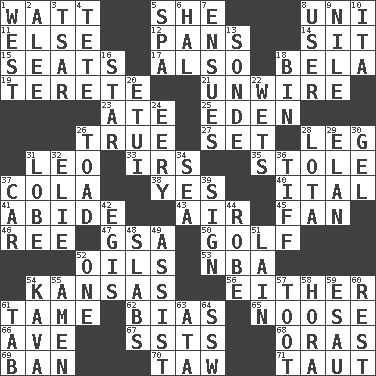 ACROSS 1. Electrical Unit 5. A female animal or person 8. Corn or form start 11. Otherwise 12. Zero-star reviews 14. Be seated 15. Theater features 17. In addition 18. Actor Lugosi 19. Cylindrical with tapered ends 21. Undo the wiring of 23. Had dinner 25. Locale of original sin 26. Loyal 27. Put into a specified state 28. Part of a journey 31. Lion 33. Big collection agency 35. Fur scarf 37. Root beer relative 38. Affirmative reply 40. Slanted text style (abbr.) 41. Tolerate 43. Atmosphere 45. Air blower 46. To separate or throw off 47. Girls' org. (abbr.) 50. Eighteen holes 52. Petroleums 53. Basketball assoc. 54. Sunflower state 56. One or the other 61. Docile 62. Prejudice 65. Trap for birds or small mammals 66. "___ Maria" 67. Fast planes 68. Mouths or openings 69. Prohibit 70. The 23rd letter of the Hebrew alphabet 71. Tense DOWN 1. Compass direction 2. Toward shelter 3. Russian ruler of old 4. Wig 5. Health resort 6. Actor Linden 7. Takes place subsequently 8. One who uses or employs something 9. Mediterranean tributary 10. Call ___ day 13. Something which is sent 16. Play the lead 18. Storage container 20. Needle case 22. Soaks 24. Suggestive of the supernatural 26. Frog relative 28. Globular water bottle used in Asia 29. Enthusiasm 30. Set 31. Ear part 32. Writer Wiesel 34. Ocean 36. Small quarrel 37. Auto 39. Signal 42. Armor plate that protects the chest 44. Loose flowing garment 48. Broad, flat, thick pieces 49. Help 51. (Had) reclined 52. Single 54. Polynesian shrub of the pepper family 55. So be it 57. A blast of a horn 58. Israeli folk dance 59. He sold his birthright 60. Repose 61. Keyboard key 63. _ moment's notice (2 wds.) 64. Compass dir.