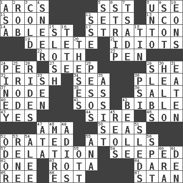 ACROSS 1. Arches 5. Fast jet (abbr.) 8. Purpose 11. Within a short period 12. Arranges properly for use 13. Non-commissioned officer (abbr.) 14. Most capable 17. Ski resort town in Vermont 19. Erase 21. Foolish or stupid persons 22. Writer of Portnoy's Complaint (1969) 23. Writing instrument 24. For each 27. Ooze 29. A female animal or person 32. From or relating to Ireland 34. Ocean 36. Entreaty 37. Connecting point 38. Double-curved letter 39. Table seasoning 40. Locale of original sin 41. Mayday 42. Instruction Manual for Humans 43. It is so 44. Male parent of an animal 46. Boy, to dad 47. Housemaid (var.) 50. Oceans 52. Spoke pompously 55. Ringlike coral islands and reefs 57. Conveyance 59. Oozed 62. Single 63. Roll call or roster of names 64. Have the gumption 65. Portuguese money of account (variant) 66. Eastern Standard Time (abbr.) 67. Comedian Laurel of Laurel & Hardy DOWN 1. White ___ sheet 2. Director Reiner 3. Having a low temperature 4. Contemptuous expression 5. Arrange properly for use 6. Remove all contents or possession from 7. Sadhe (variant) 8. To (old English) 9. Native of Scotland 10. Immeasurably long periods of time 12. Compass dir. 15. Agitate, as a liquid 16. Wig 18. Shallow baking pan 20. College papers 24. Abounding in pines 25. Wear away 26. Amusement-park features 28. Mexican monetary units 29. Thick slices 30. Phone greeting 31. Ingested 33. Elected rep. 35. Aid 36. 23rd letter of the Greek alphabet 42. Calif. Air Force Base 45. Vintage cars 47. "One Day ___ Time" 48. Distance measurement (Brit.) 49. Goodbye (Sp.) 51. Bobsleighs 52. Scent 53. French philosopher Descartes 54. Toward shelter 55. Santa ___, CA 56. Argument over a trivial matter 58. Baseball player Mel 60. Epoch 61. Lair