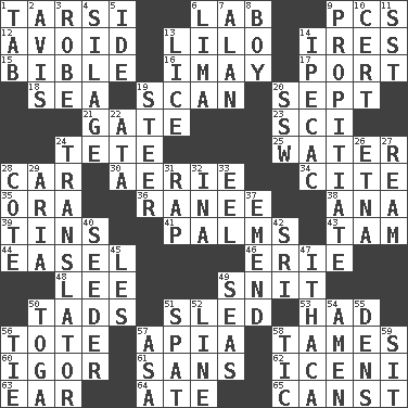 ACROSS 1. Tarsus (plural) 6. Experiment locale 9. Personal Computers (abbr.) 12. Stay clear from 13. _ and Stitch 14. Angers 15. Instruction Manual for Humans 16. "If ____ say so..." 17. Left side of a ship or aircraft 18. Ocean 19. Skim 20. Back-to-school mo. 21. Yard entry 23. _-fi 24. False hair 25. Wetness 28. Automobile 30. Nest on high 34. Quote 35. Mouth or opening 36. The wife of a rajah (variant) 38. Santa ___, CA 39. Airtight sealed metal containers 41. Insides of hands 43. Scottish cap 44. Artist's stand 46. One of the Great Lakes 48. Area sheltered from the wind 49. In a ____ (agitated or irritated) 50. Bits 51. Downhill vehicle 53. Possessed 56. Haul 57. Capital of Western Samoa 58. Softens 60. Composer Stravinsky 61. Without 62. Ancient Celtic tribe of eastern Britain 63. Hearing organ 64. Had dinner 65. 2nd pers. sing. pres. of can (arch.) DOWN 1. Bar bill 2. Advice 3. Loose flowing garment 4. Fodder prepared in a silo 5. Binary compound 6. Pale green bean 7. ____ Jay Lerner 8. Male child 9. Appease 10. Foregone conclusion 11. Fast jet (abbr.) 13. Louse (plural) 14. Medicinal drug used to evoke vomiting 19. Bull 20. Compass dir. 22. "One Day ___ Time" 24. Interpreter 26. Inactive volcano in Sicily 27. 480, 500 or 516 sheets of paper 28. ____ d'Azur (French Riviera) 29. Operatic vocal solo 31. Reproach for some lapse or misdeed 32. _ tizzy (2 wds.) 33. Snakelike fish 37. Make improvements or corrections to 40. Sowing specialist 42. Indian title of respect (Mr.) 45. French article 47. New York city 49. Oceans 50. Ancient Roman robe 51. Petty quarrel 52. Actor's bit 54. So be it 55. Cub Scout units 56. Make a knot 57. White ___ sheet 58. Nervous spasm 59. Be seated