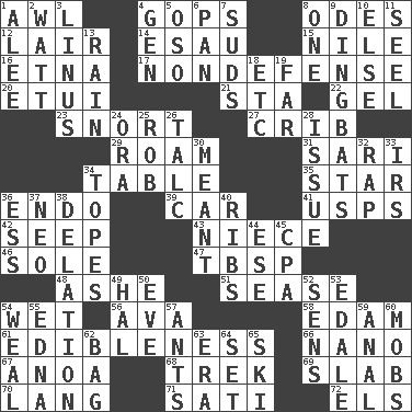 ACROSS 1. Leather borer 4. Republicans 8. Lyric poems 12. Den 14. He sold his birthright 15. "Death on the ____" 16. Inactive volcano in Sicily 17. Unrelated to defense, as in spending 20. Needle case 21. R.R. building 22. Set 23. Derisive sound 27. Baby bed with high sides 29. Wander 31. Indian skirt 34. Eating place 35. Play the lead 36. Inside; within (prefix) 39. Auto 41. United States Postal Service (abbr.) 42. Ooze 43. Sibling's daughter 46. Not divided or shared with others 47. Cook's measure (abbr.) 48. American tennis player Robert 51. Gospel singer Marvin 54. Dripping 56. Actress Gardner 58. Dutch treat 61. The property of being fit to eat 66. Billionth: prefix 67. Small Philippine buffalo 68. Long journey 69. Thick slice 70. Austrian-born American filmmaker Fritz 71. Suttee (variant) 72. Raised railways DOWN 1. Toward shelter 2. Electrical Unit 3. "_ and Lucy" (Charlie Brown theme song) 4. Commissioned military rank (abbr.) 5. Bear (Spanish) 6. Baking dish 7. Beer foam 8. Single 9. Empty-headed or silly people 10. Otherwise 11. Stitch closed the eyes of (a falcon) 13. Precipitation 18. And so on (abbr.) 19. Distant 24. Mouth or opening 25. Director Reiner 26. Baby powder 28. Come out of 30. Intended 32. Hit sharply and swiftly 33. Big collection agency 34. Drinks excessively 36. Curvy letter 37. Modern: prefix 38. Conveyance 40. Chest bones 44. Compass dir. 45. Accounting whiz (abbr.) 49. Actor Linden 50. First lady 52. Elected reps. 53. Peak District village in England 54. Welt 55. Pulitzer Prize-winning author Ferber 57. Pismires 59. Of or related to the anus 60. Disorderly crowds 62. Container for groceries 63. Period 64. Arrange properly for use 65. What Jean-Claude Killy likes to do
